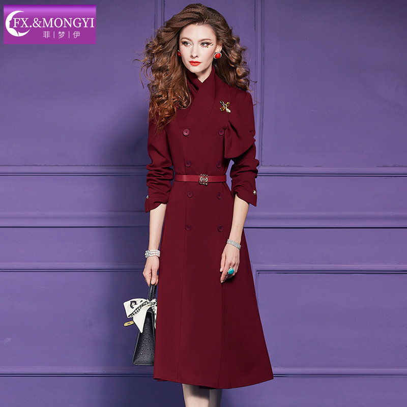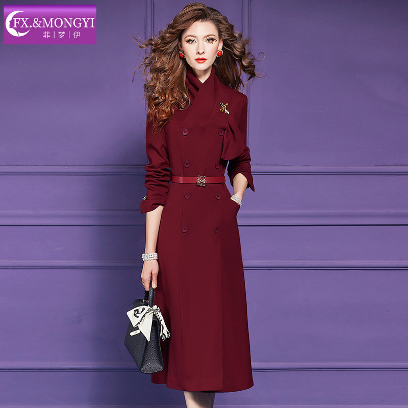 菲梦伊红色连衣裙女长袖秋装别致设计感修身双排扣气质中长款大衣