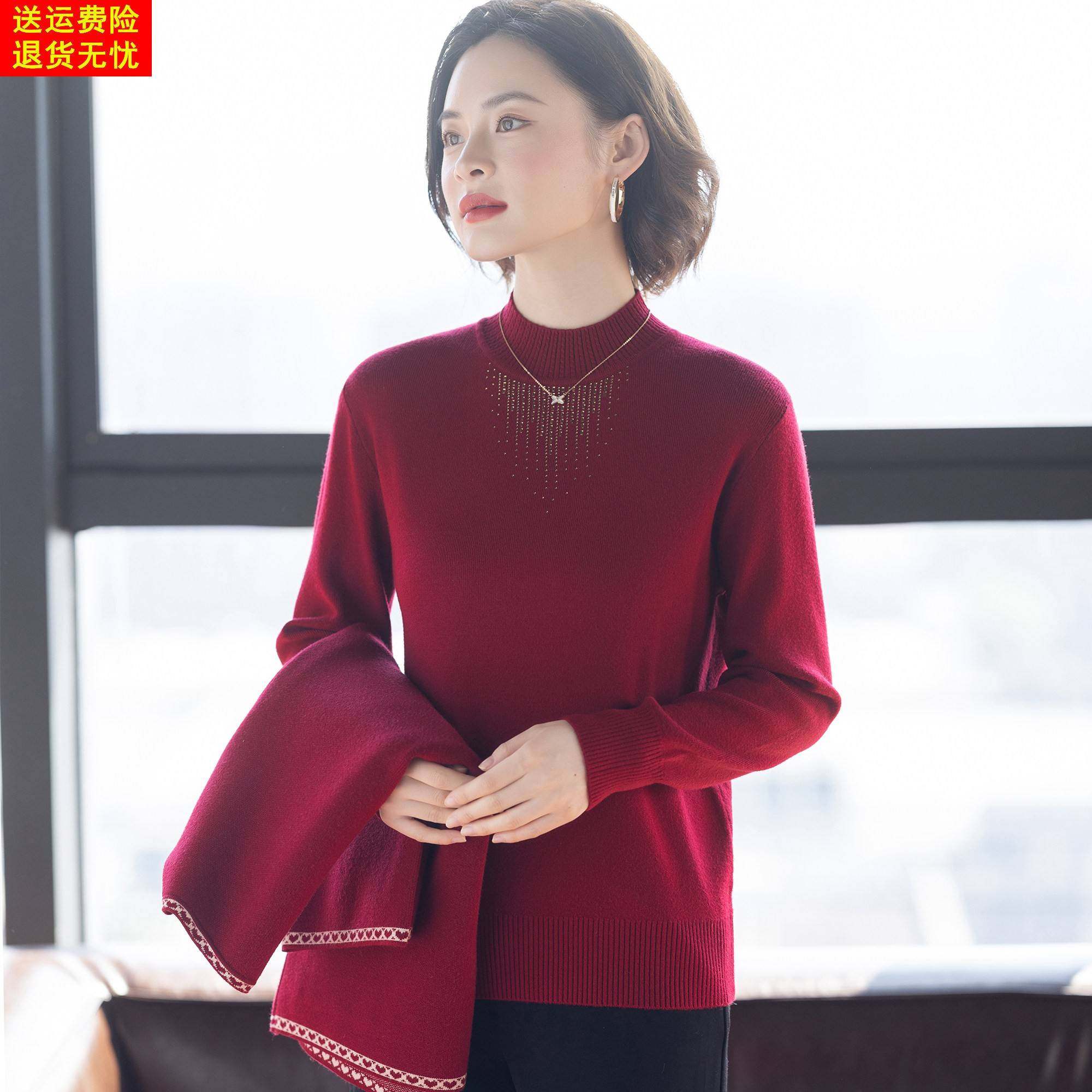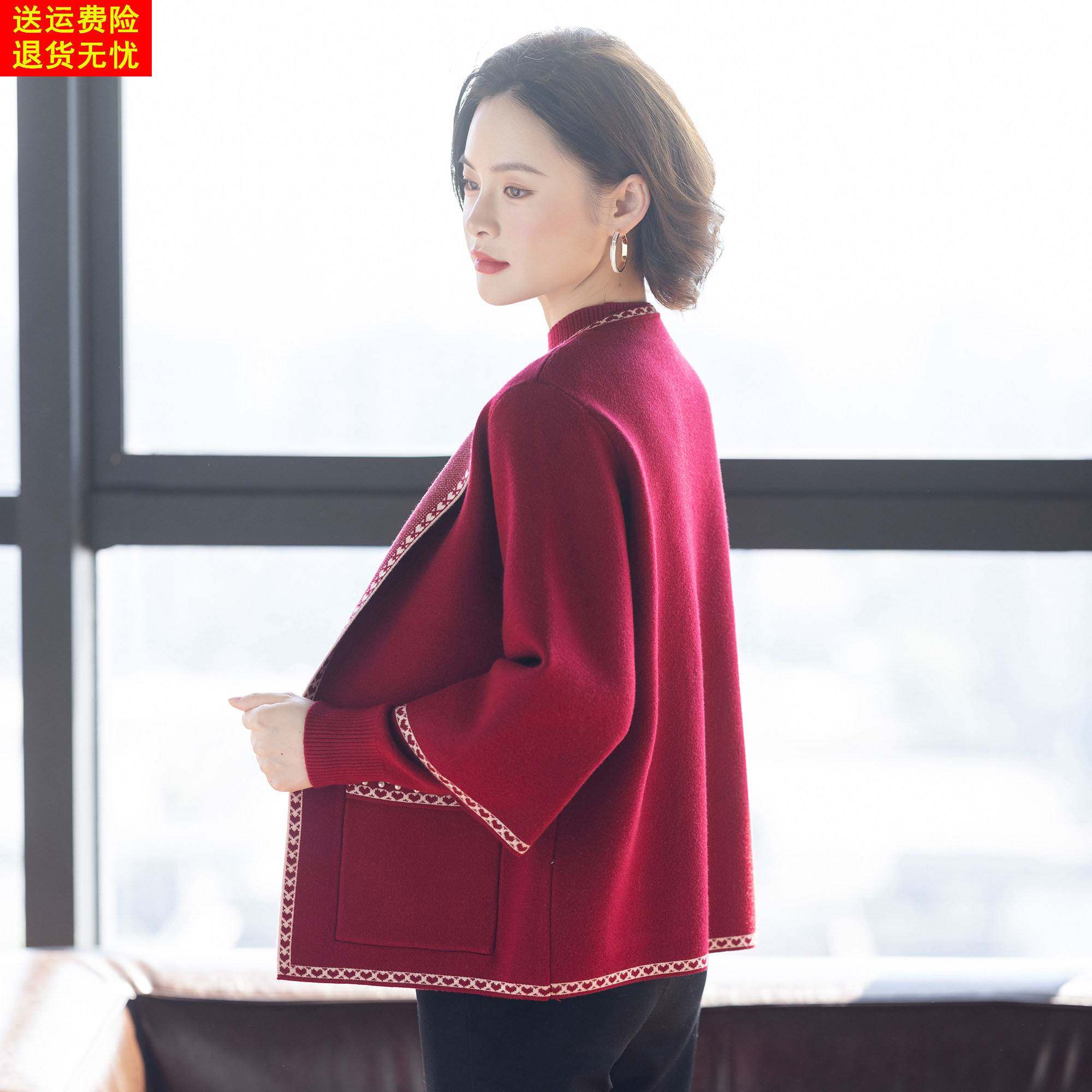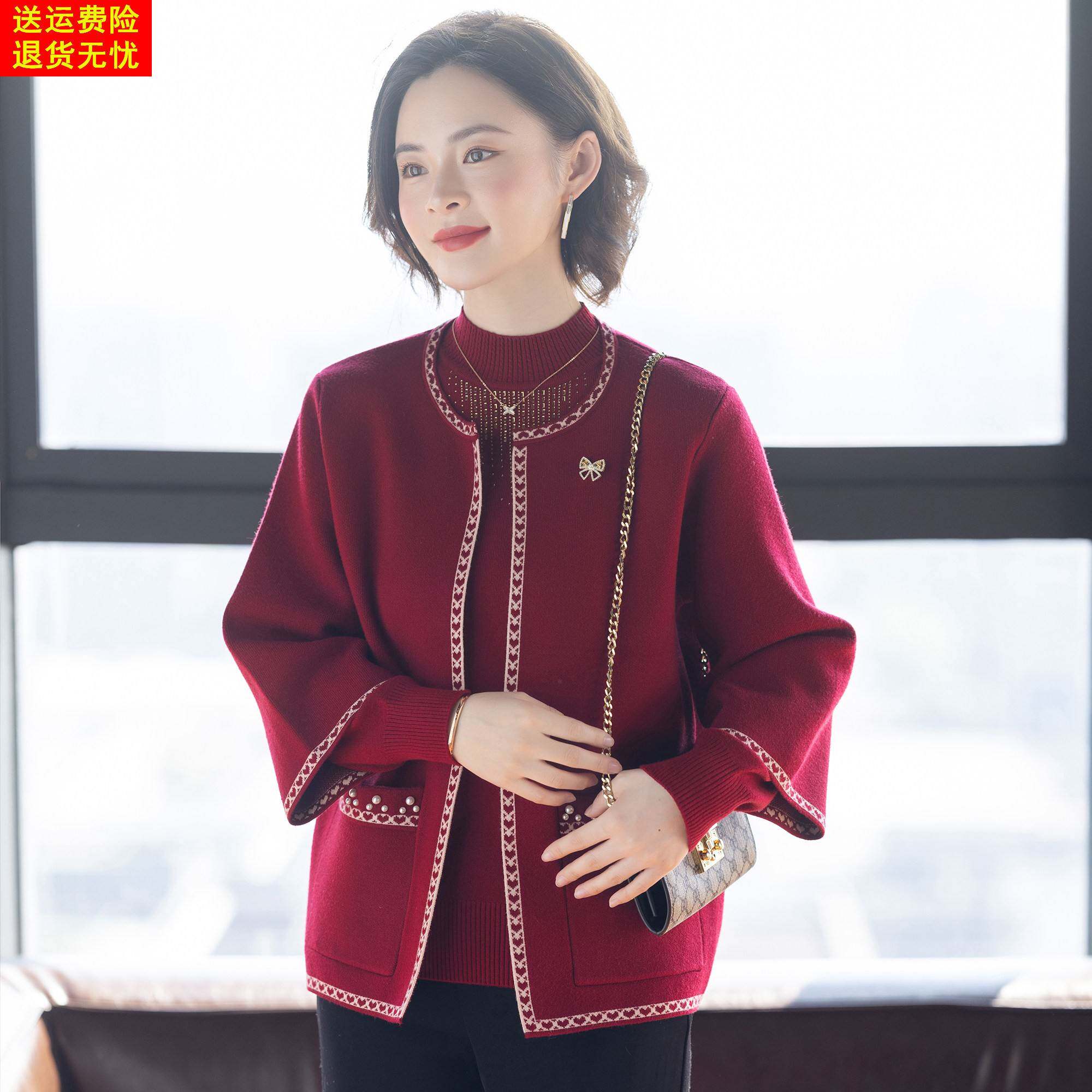妈妈冬装两件套装毛衣外套2025新款喜婆婆婚宴中老年女红色上衣服