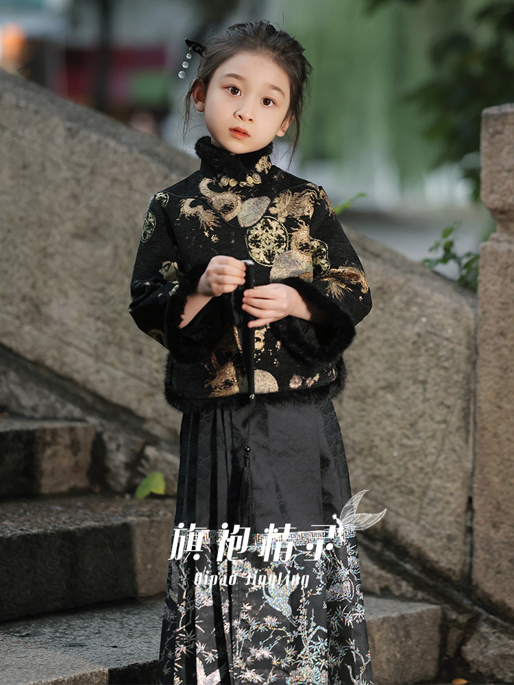 黑色明制唐装冬季长袖加绒加厚女童旗袍连衣裙古装汉服马面裙套装