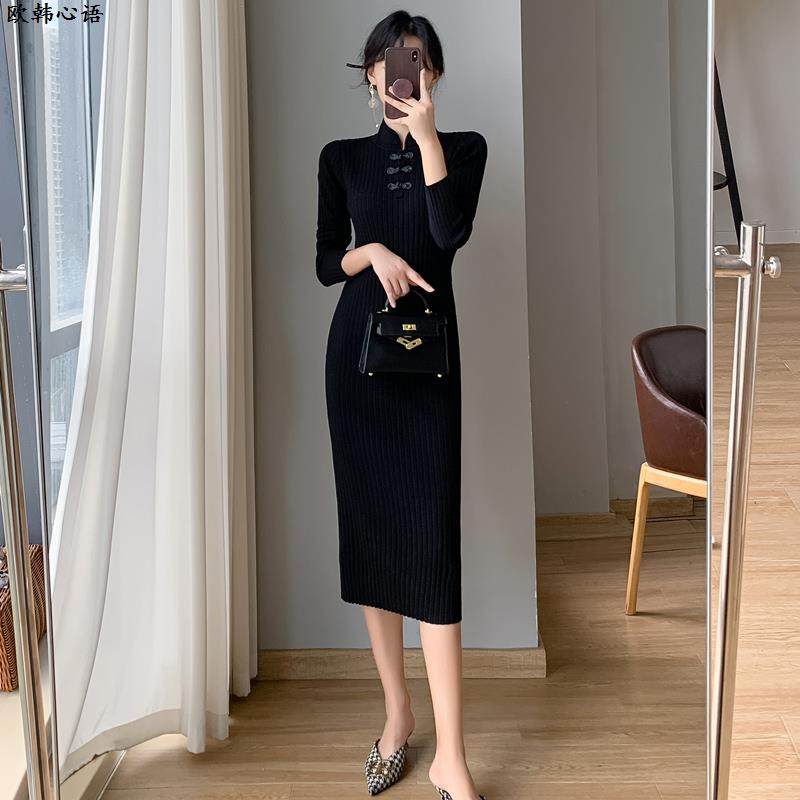 新中式改良白色旗袍针织毛衣连衣裙女秋冬修身配大衣内搭打底长裙
