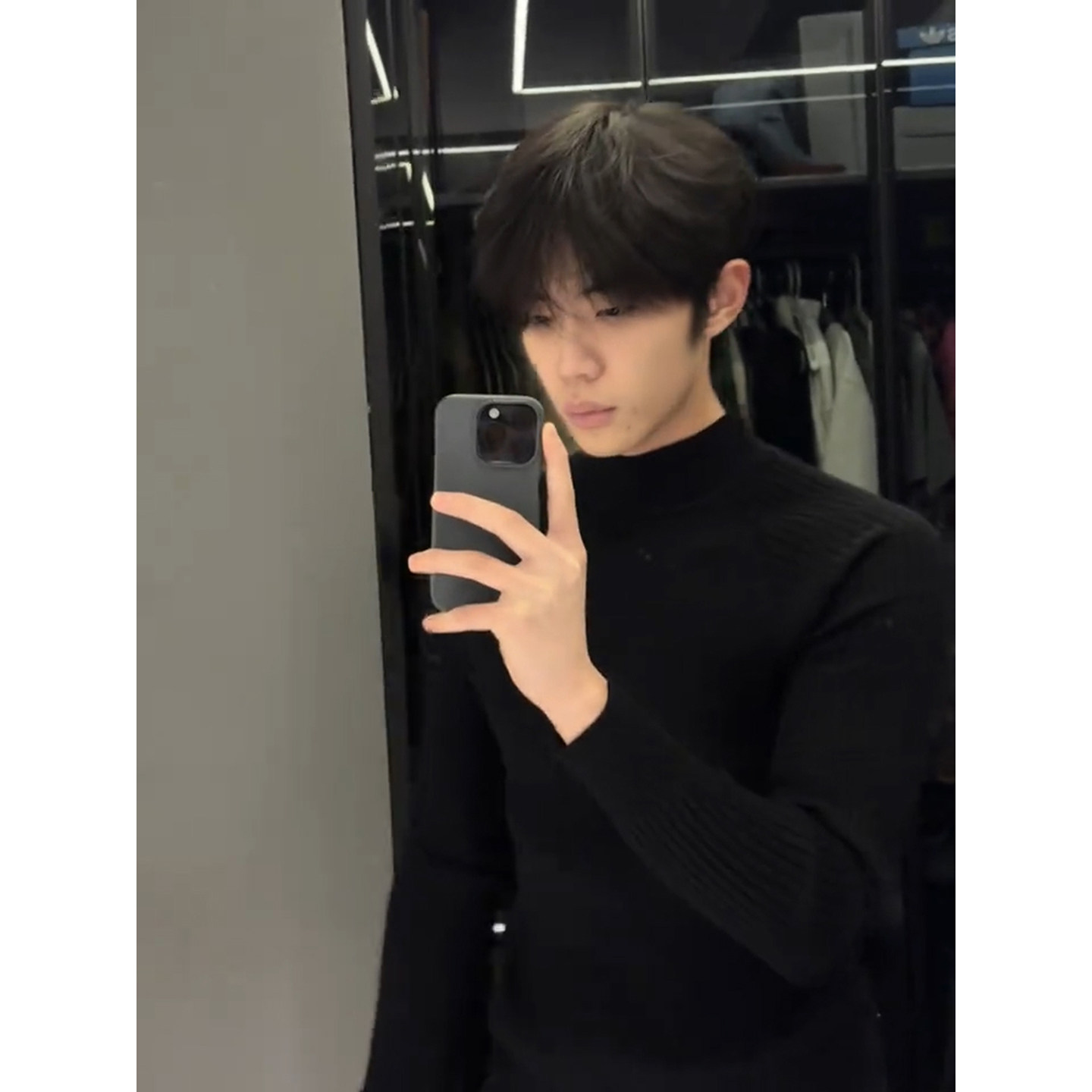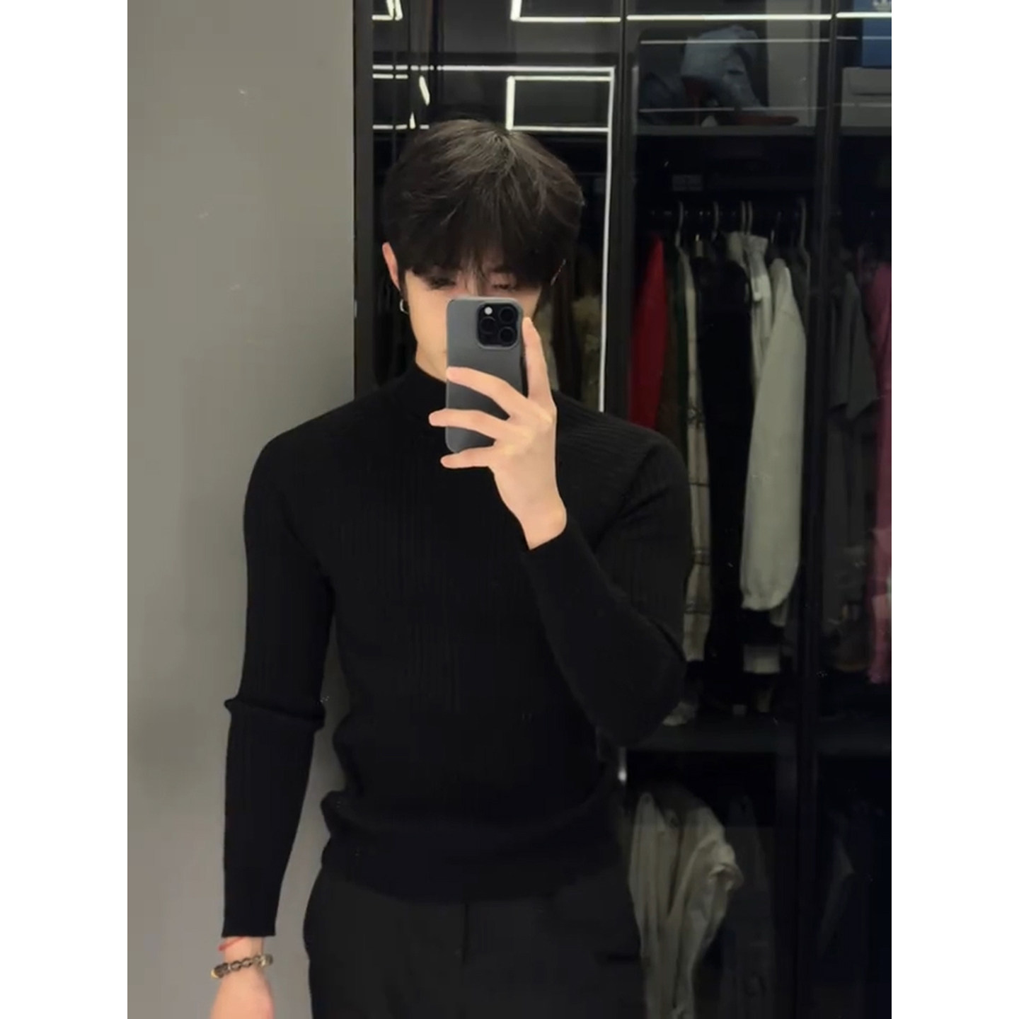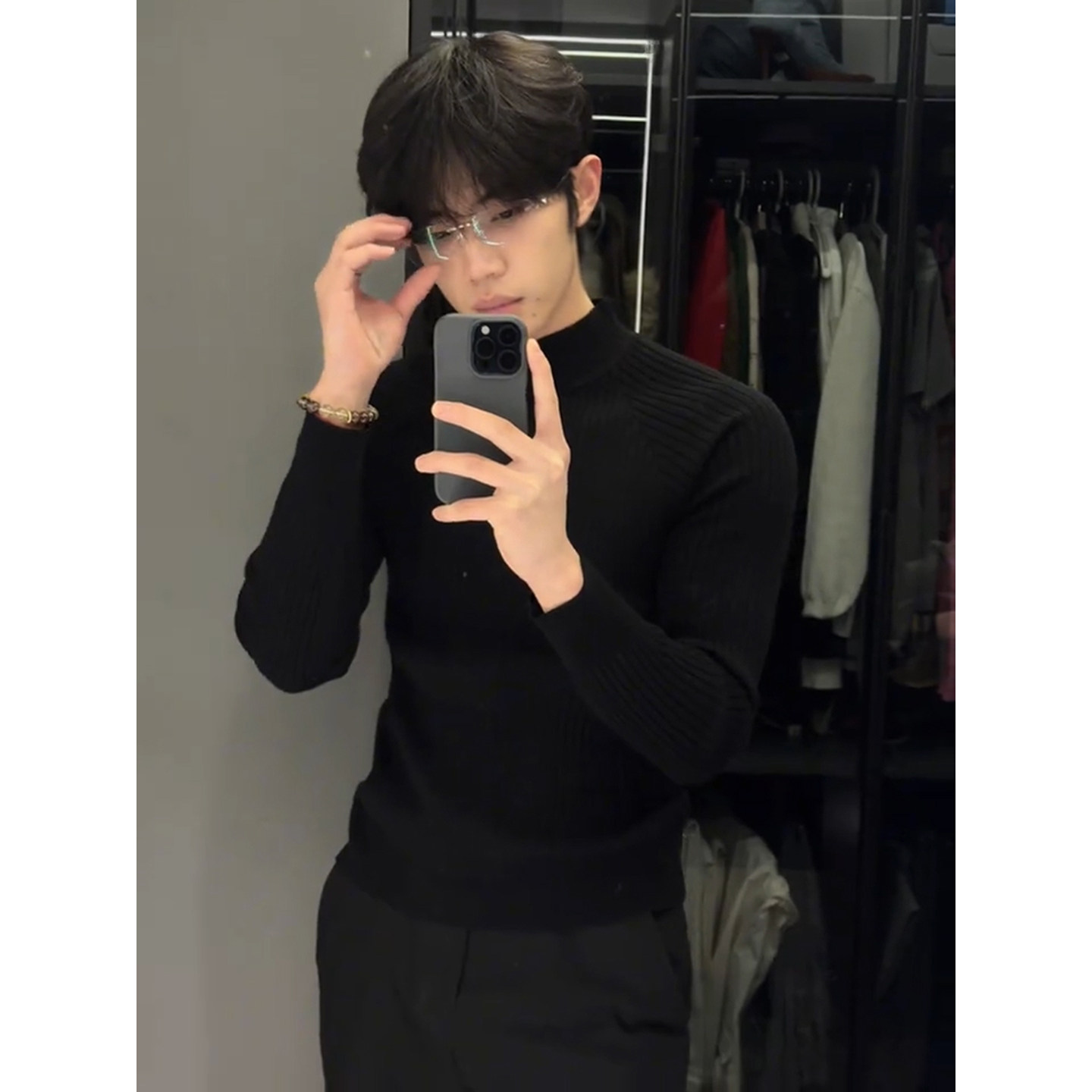 黑色坑条肌理感毛衣男款冬季高级感内搭半高领修身显瘦针织打底衫