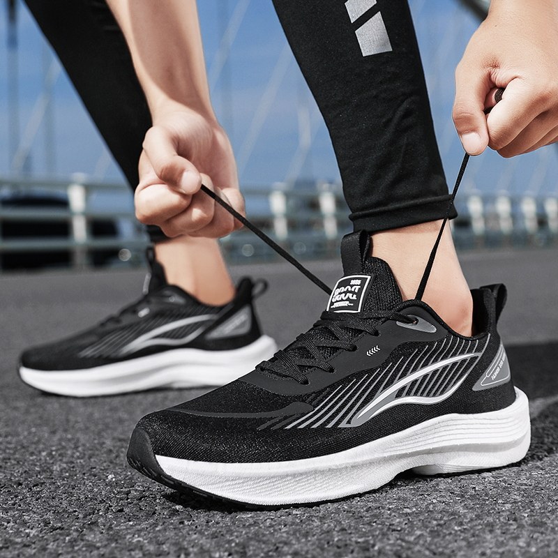 黑色运动跑鞋男轻便软底减震超轻跑步鞋青少年初中生夏季网面透气
