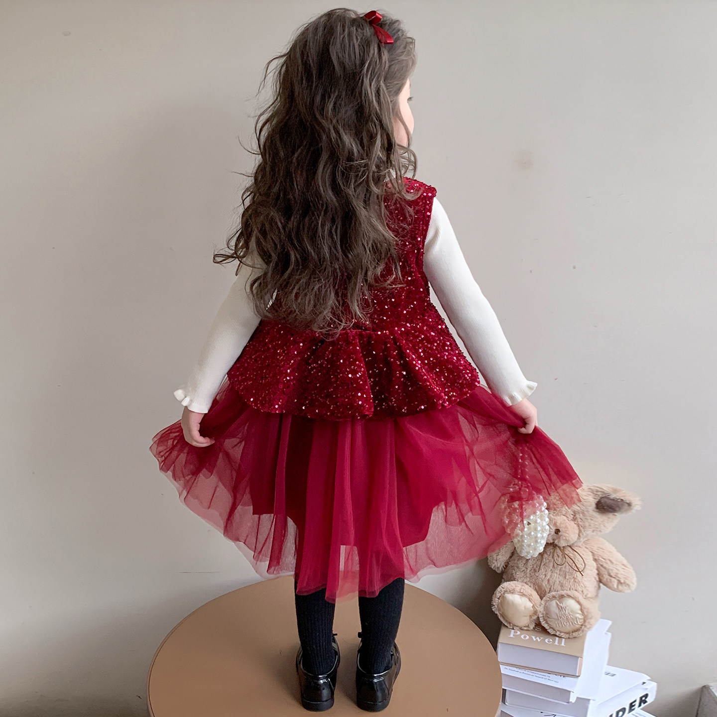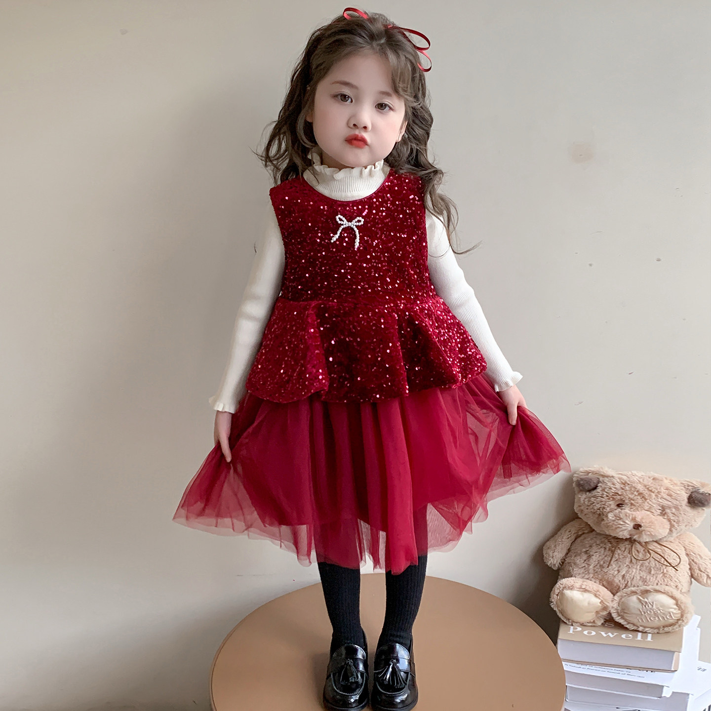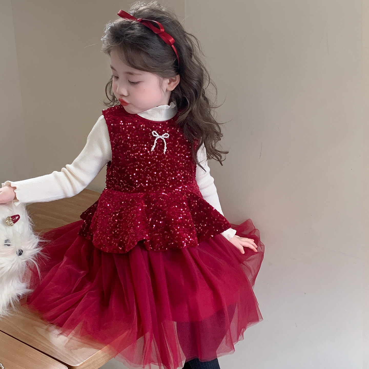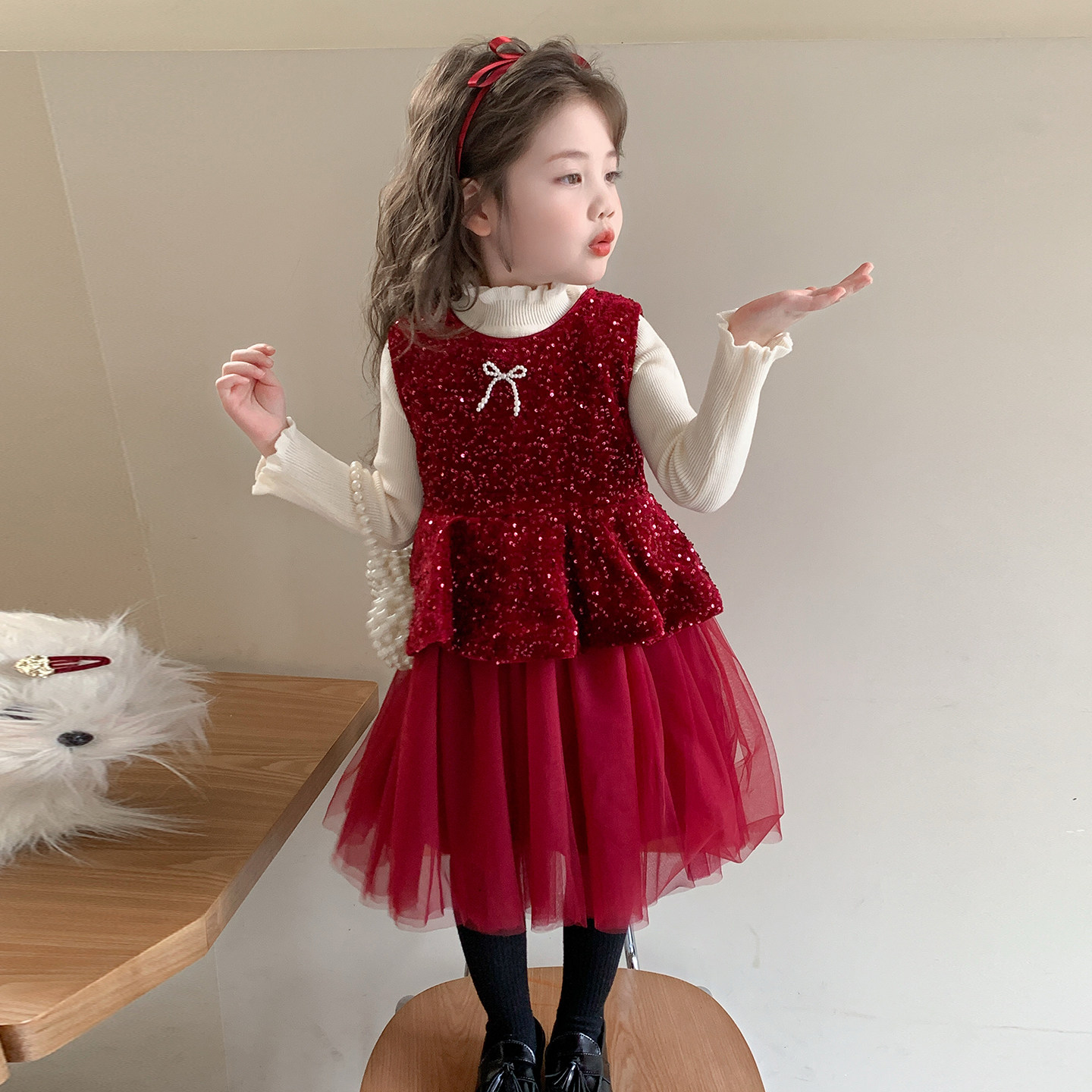 女童红色连衣裙冬季加绒儿童新年套装冬装公主裙子宝宝过年拜年服