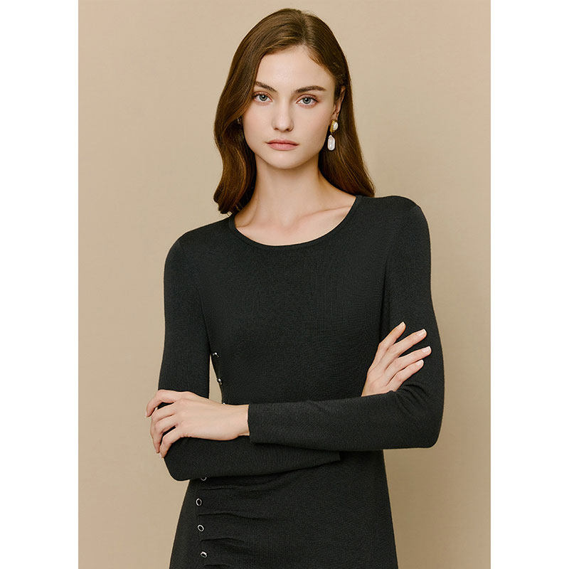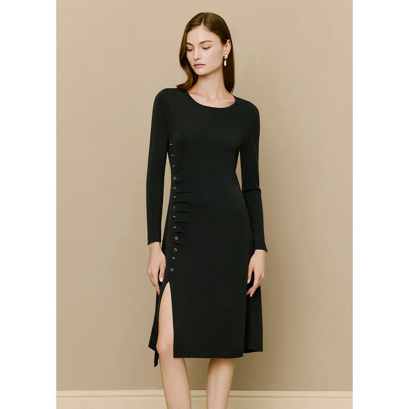 LK BENNETT黑色绵羊毛连衣裙女冬新款排扣设计感开叉中长裙