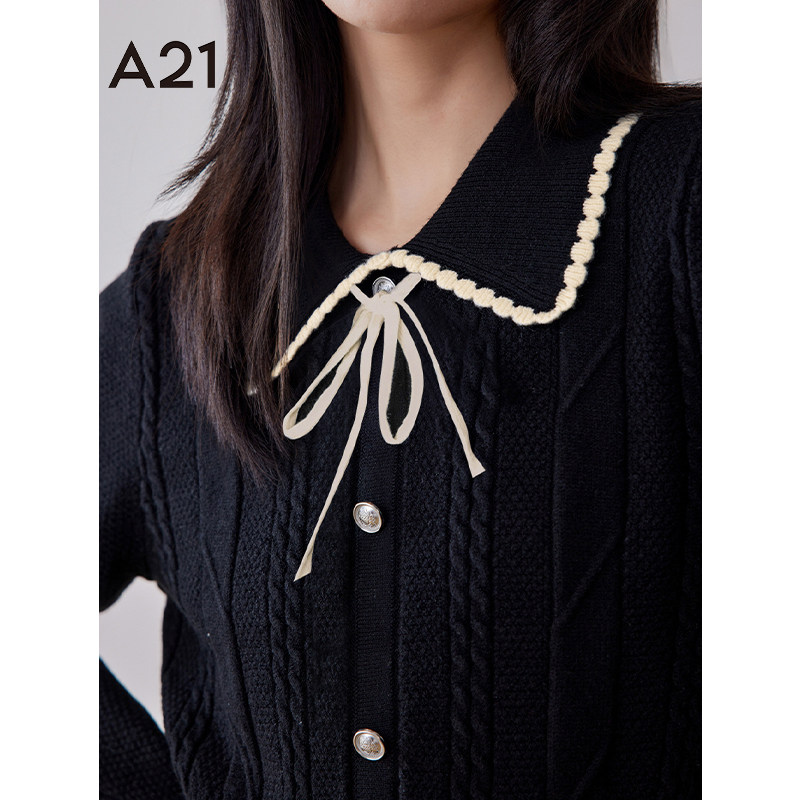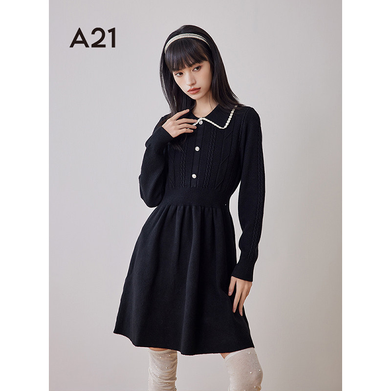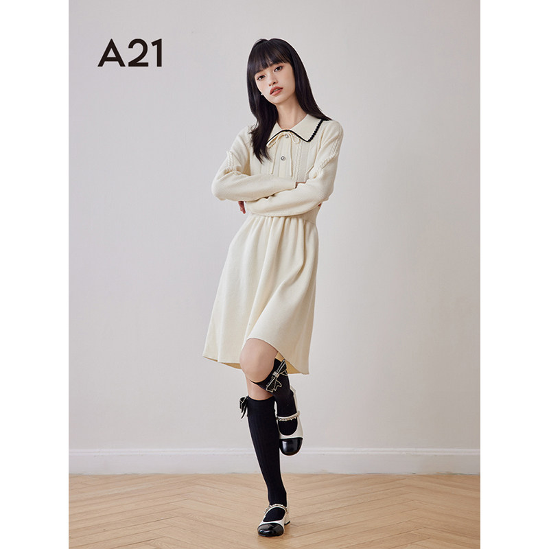 A21女装2024新款翻领连衣裙春季针织撞色小香风百搭长袖A摆中长裙