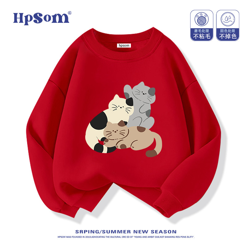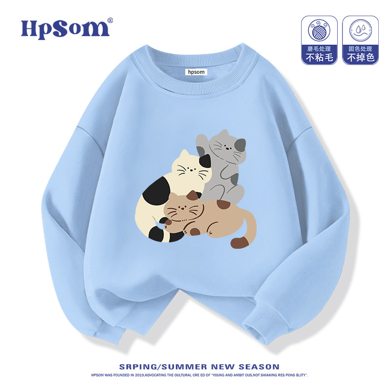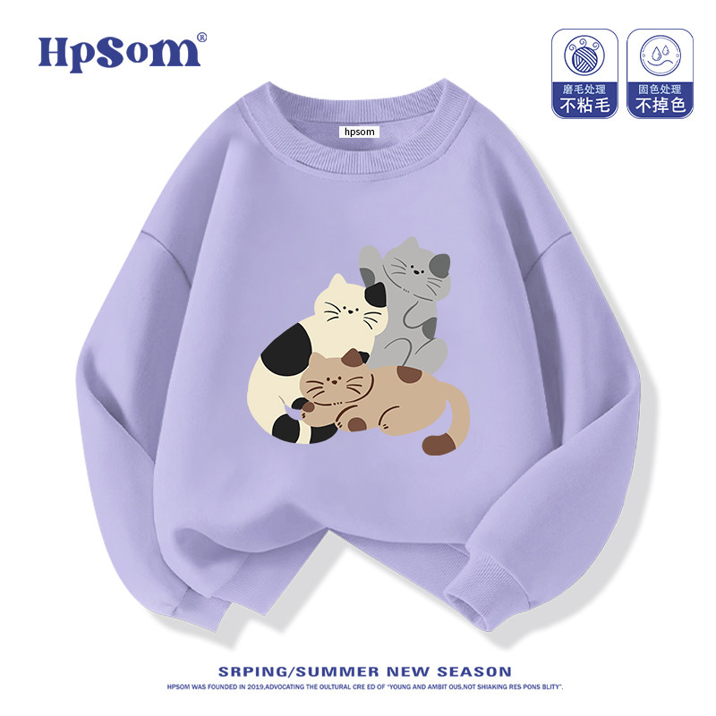 小猫儿童黑色圆领卫衣2026新款秋冬季男女孩中大童装加绒加厚洋气
