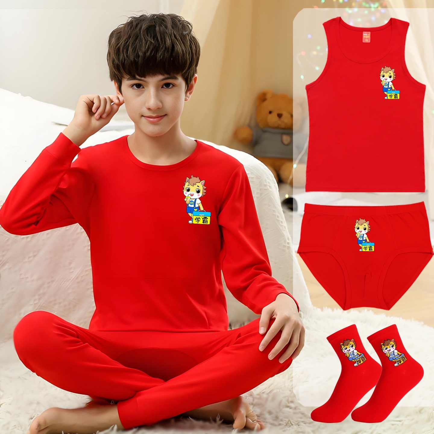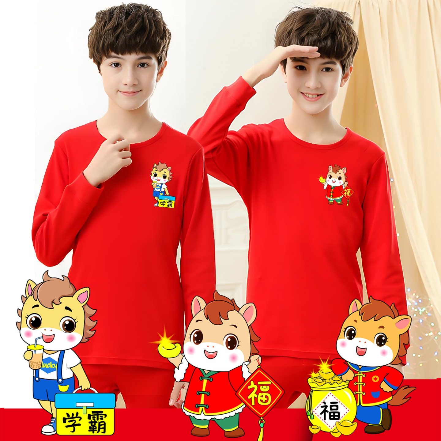 男童本命年内衣套装12岁儿童马年红衣服男孩大童纯棉红色秋衣秋裤