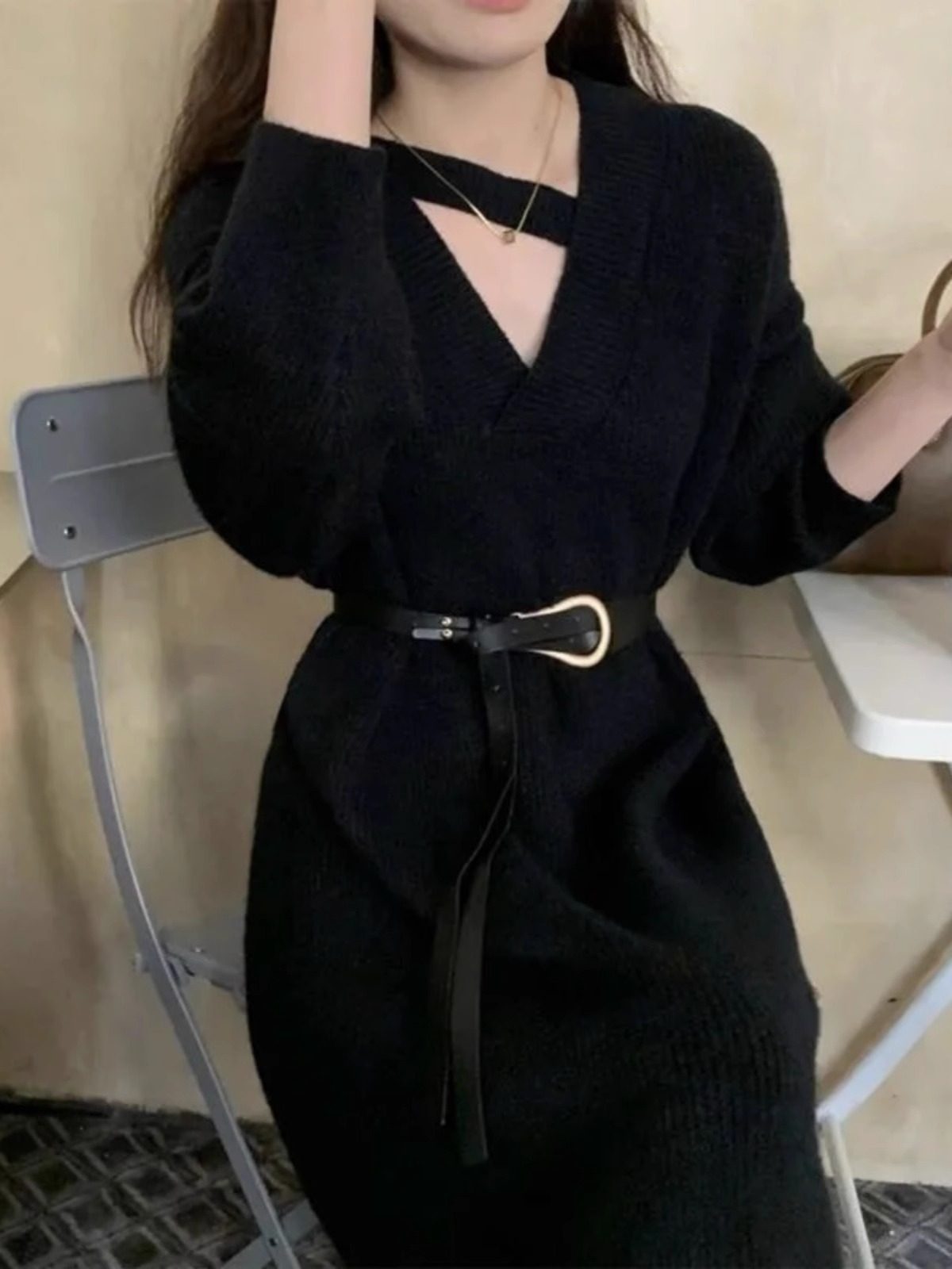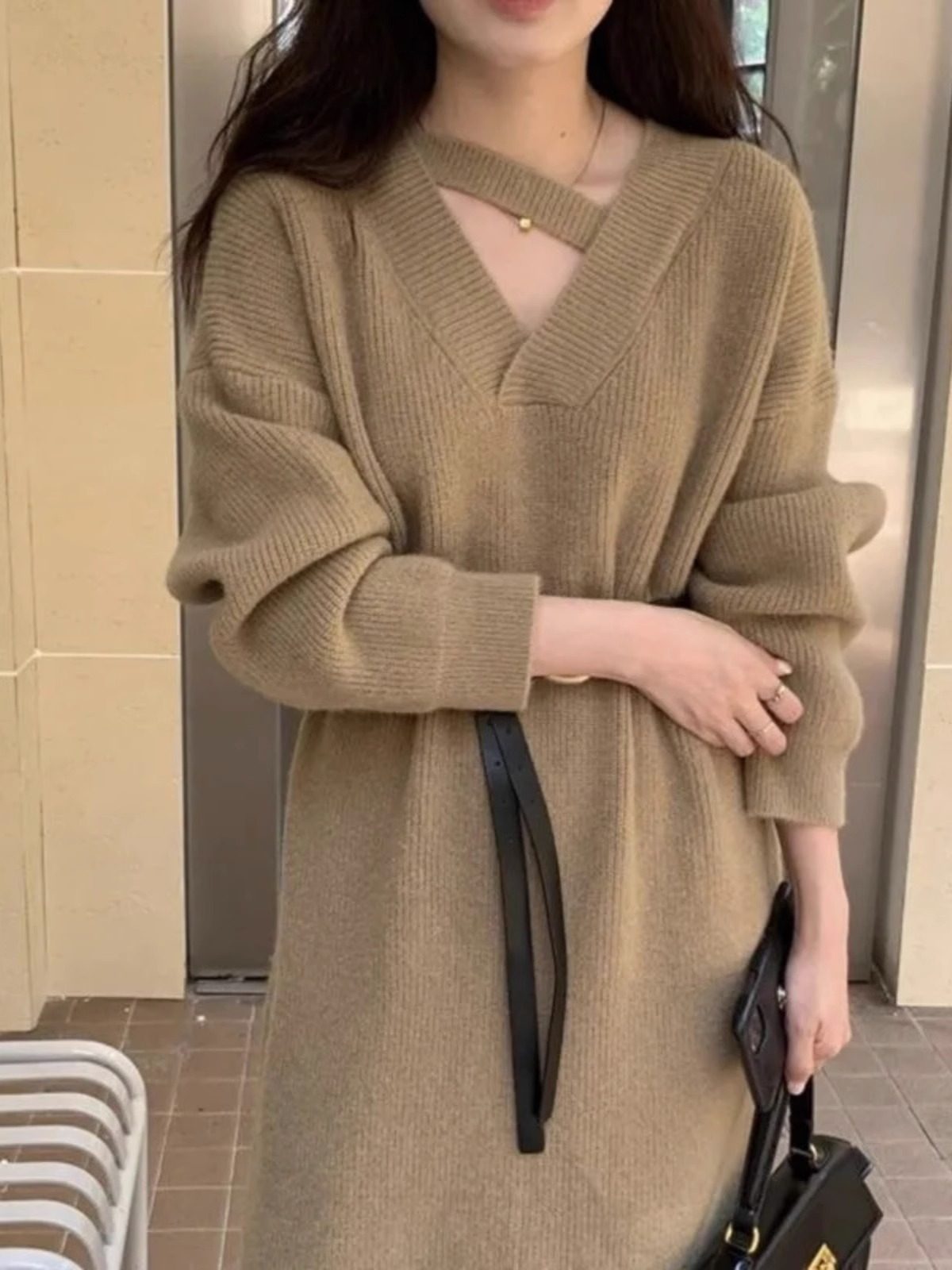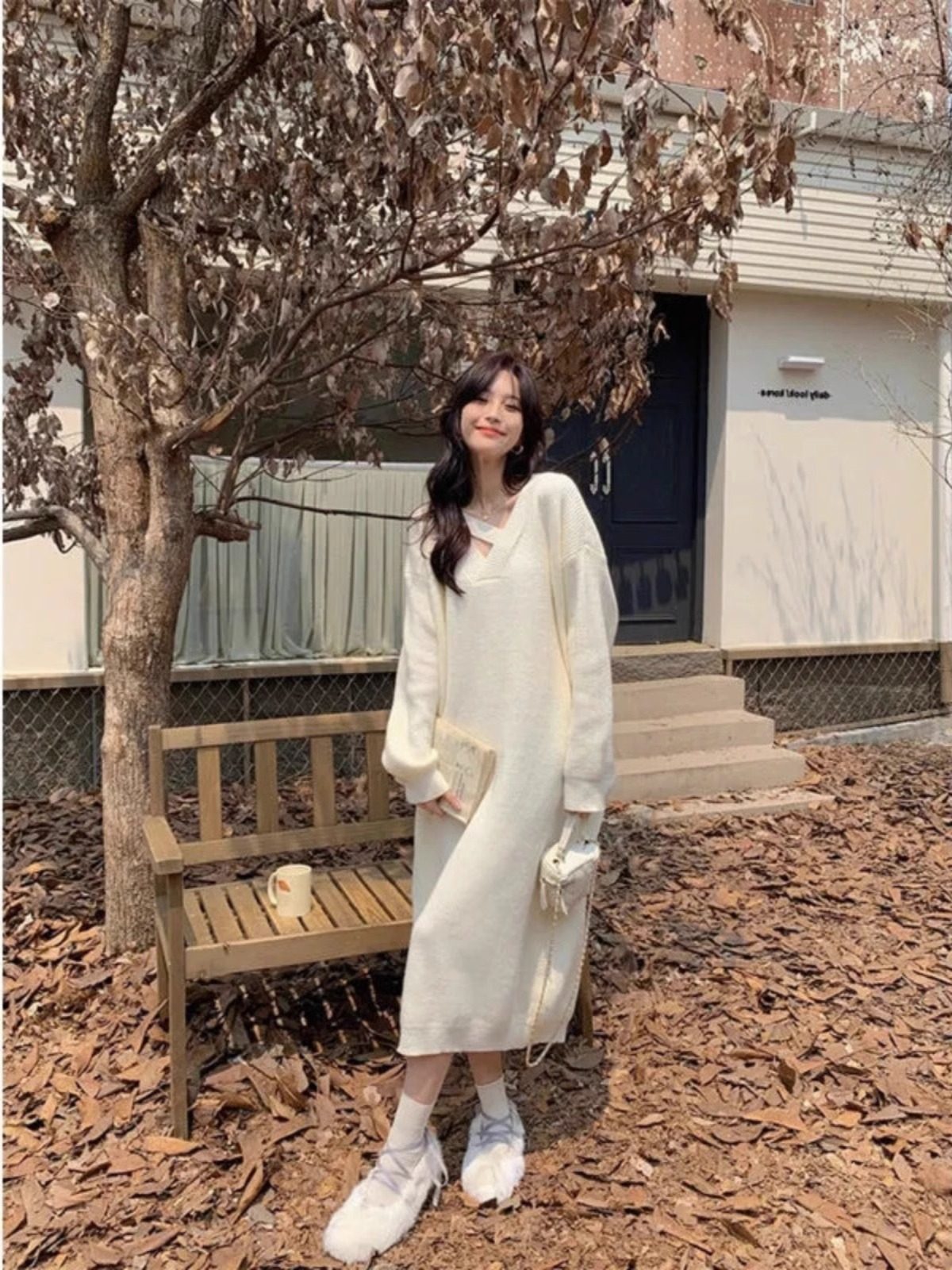 胖MM300斤加大码宽松针织新款女装秋冬款纯欲甜美风中长款连衣裙