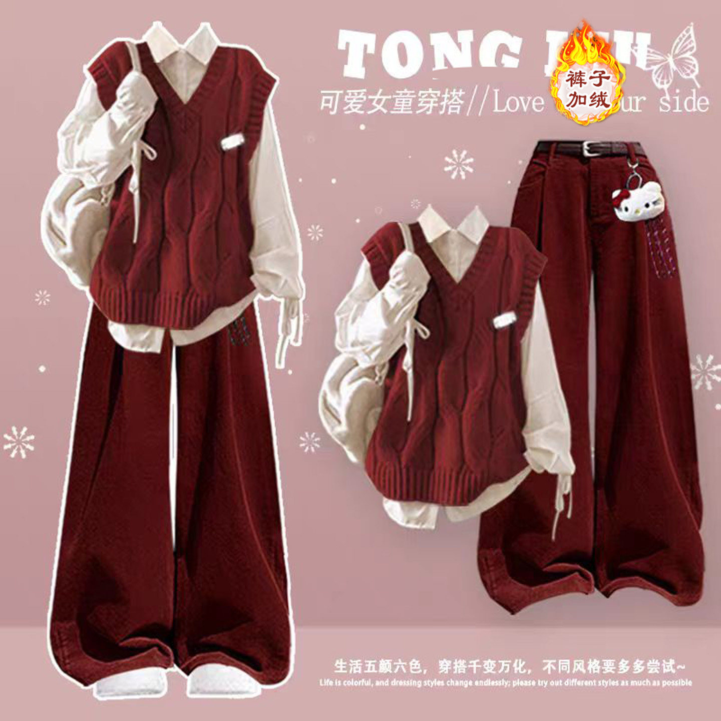 女童秋冬新年圣诞套装2025新款女大童初中生高中三件套装炸街裤子