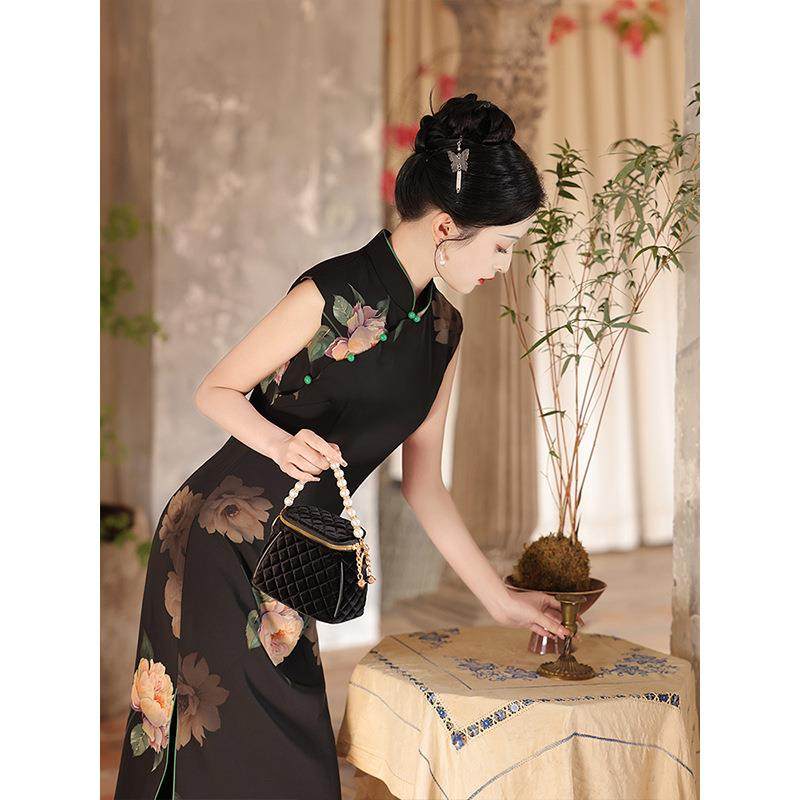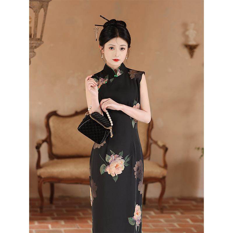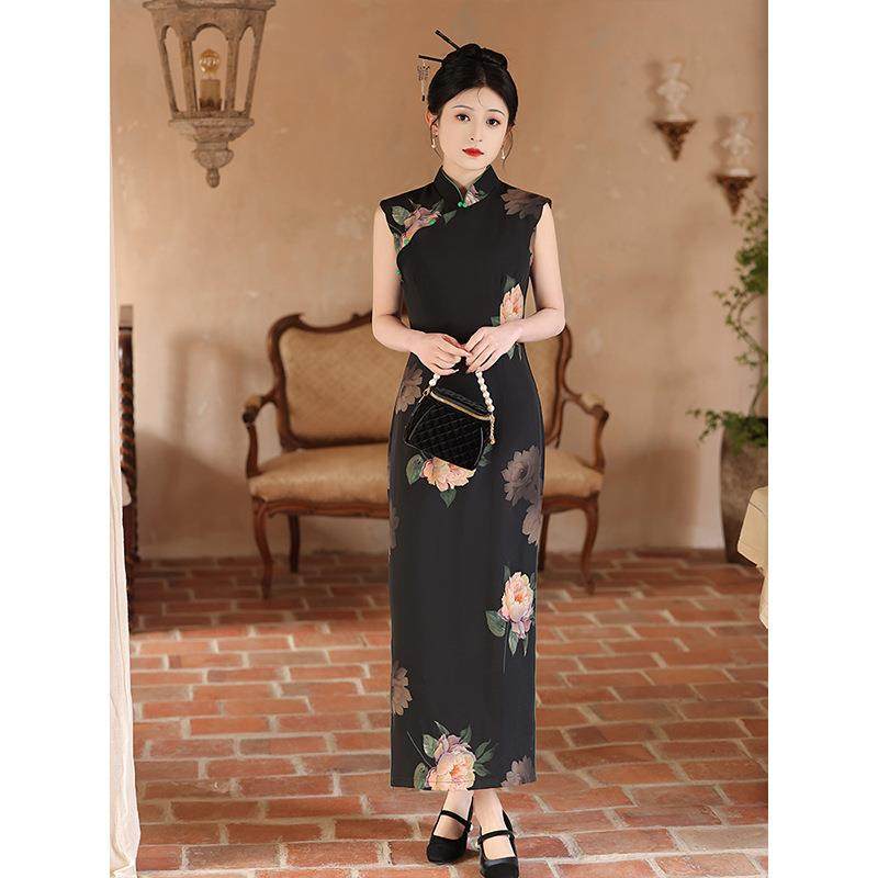 黑色无袖旗袍2024新款夏季复古绝美新中式连衣裙日常可穿修身长款