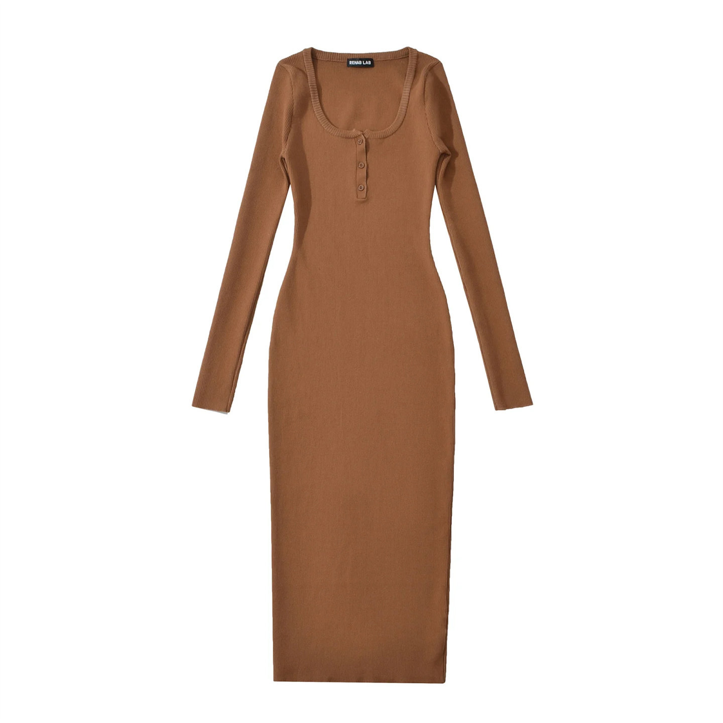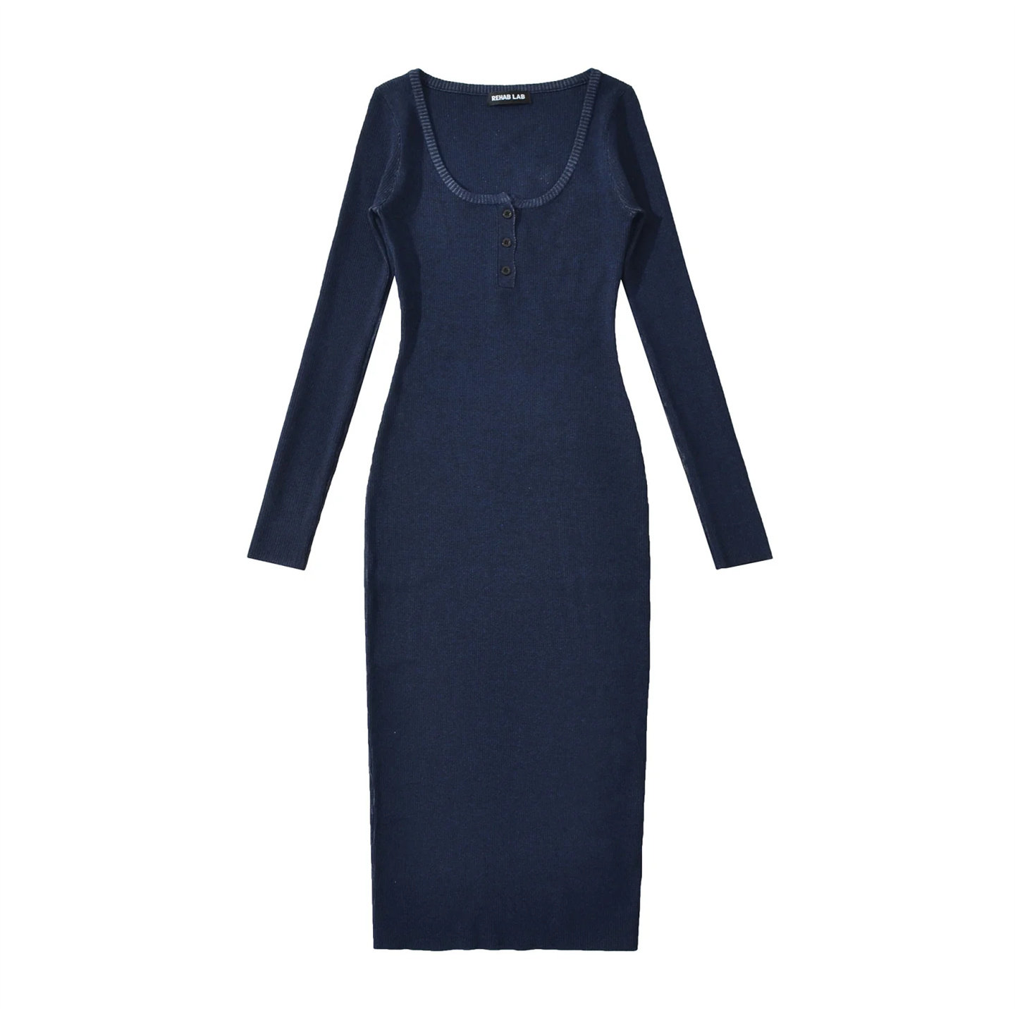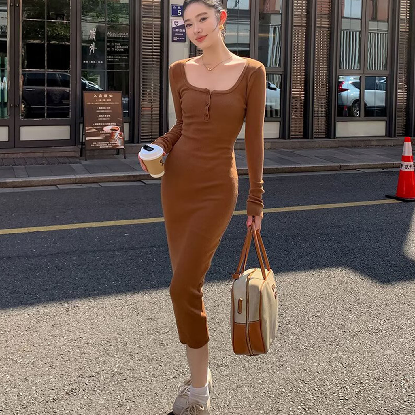 大u领长袖针织连衣裙女2025新款秋冬紧身性感包臀打底裙毛衣长裙