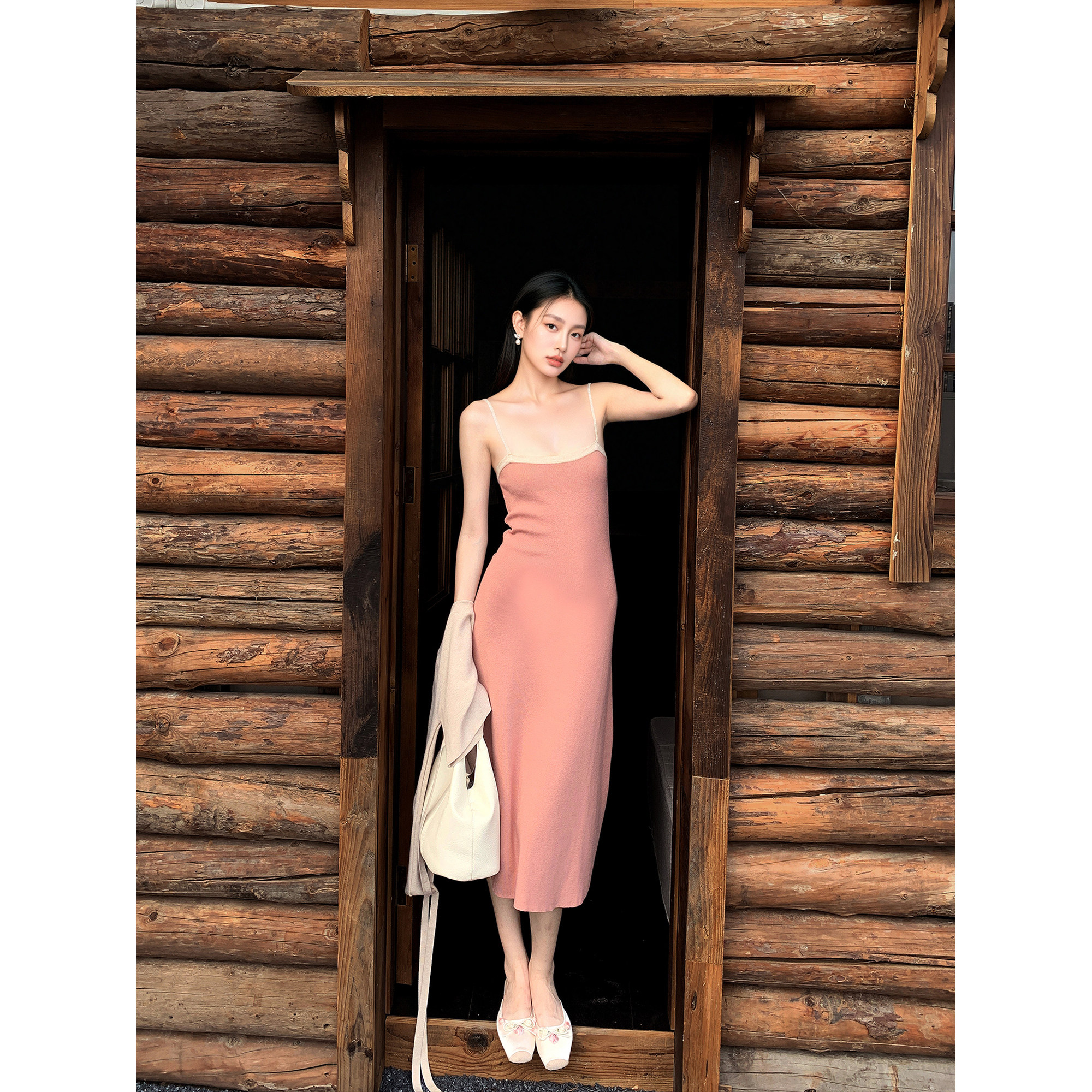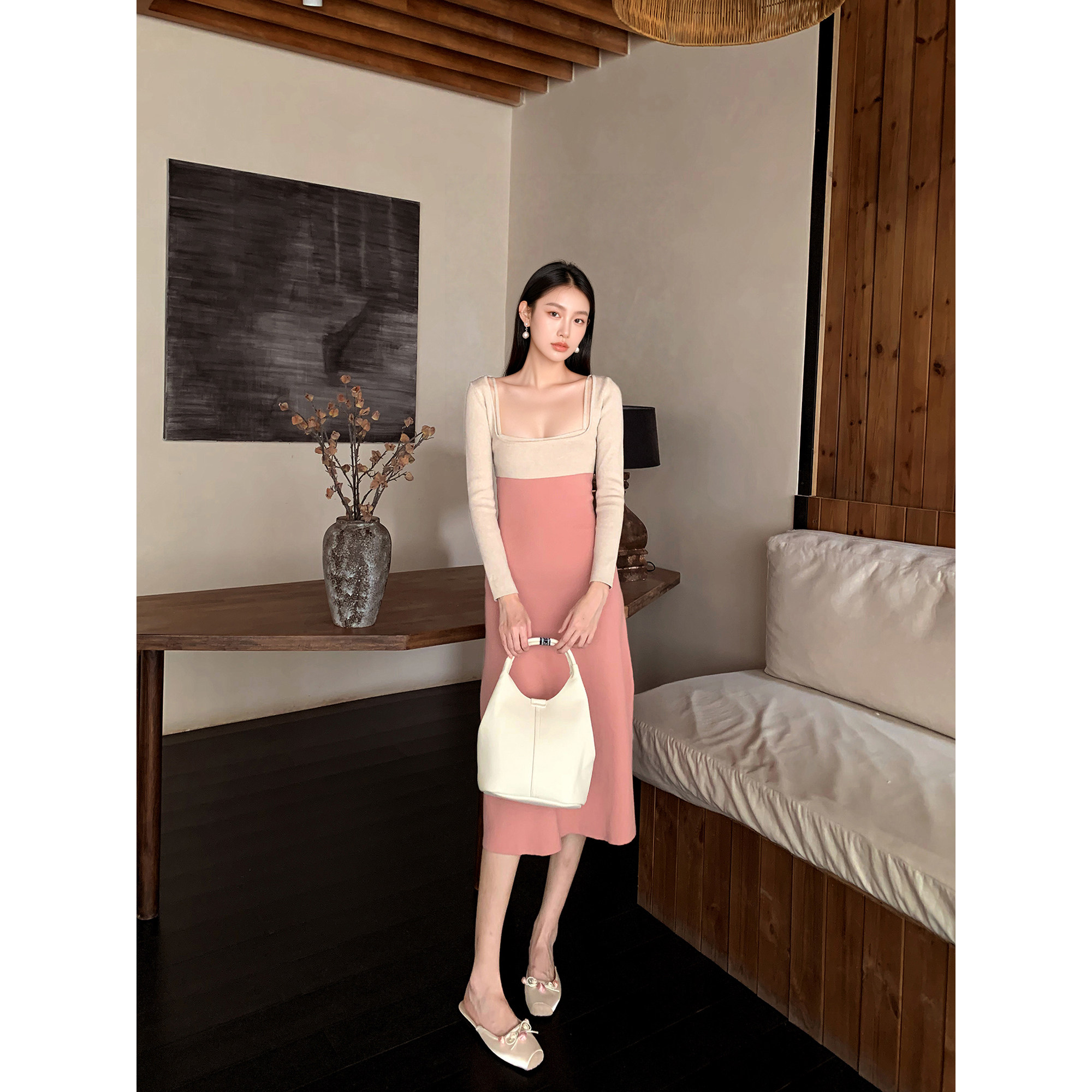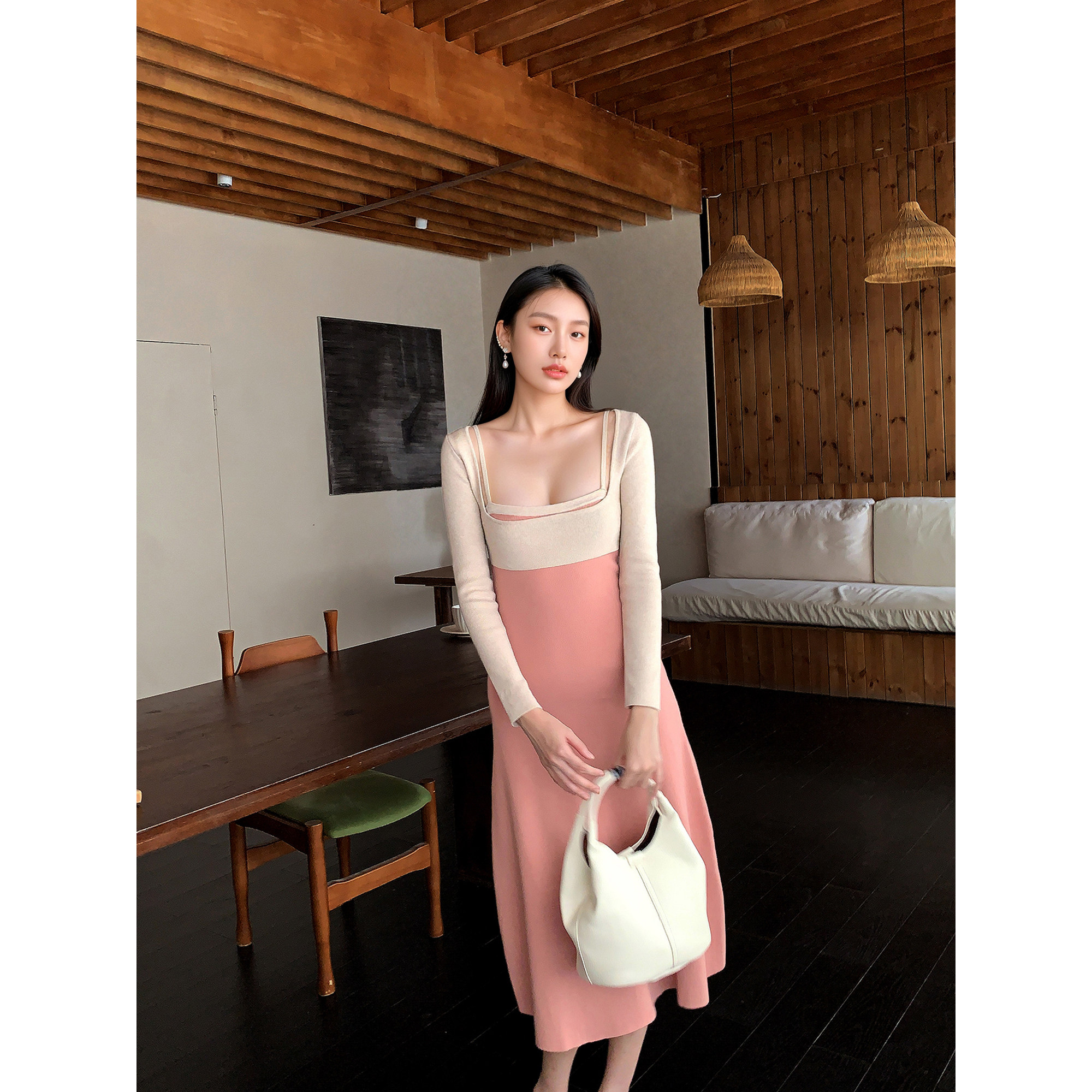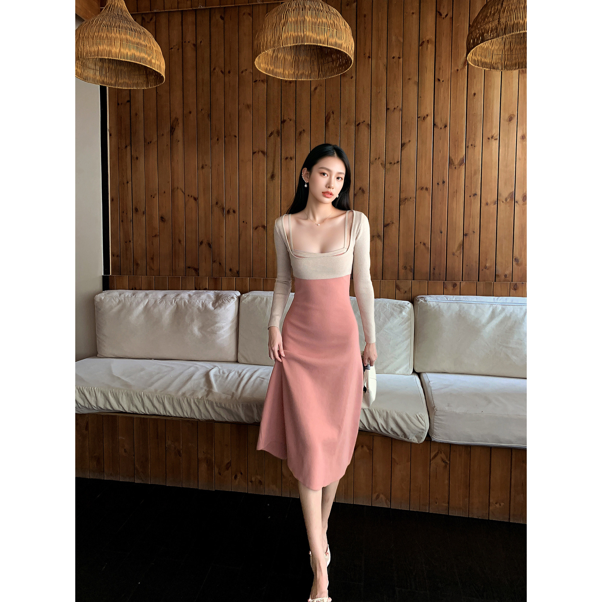 GEMQI 法式优雅粉色吊带连衣裙女秋冬长袖裹胸a字针织长裙两件套