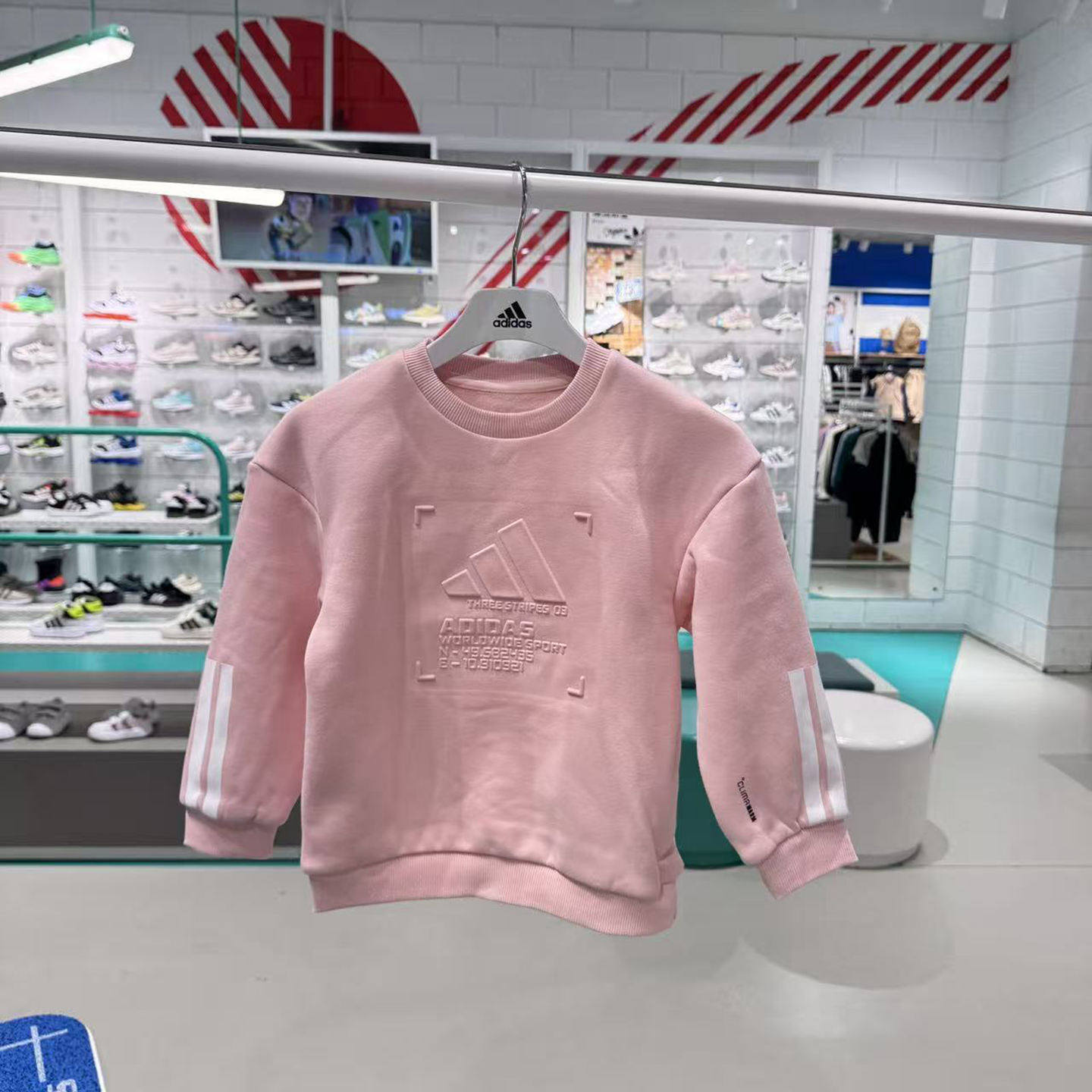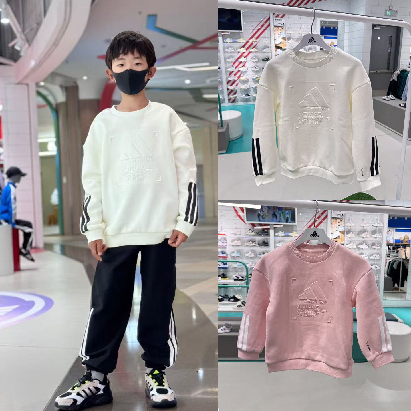 阿迪达斯童装25秋冬款男女童加绒圆领长袖套头衫运动卫衣KB5097