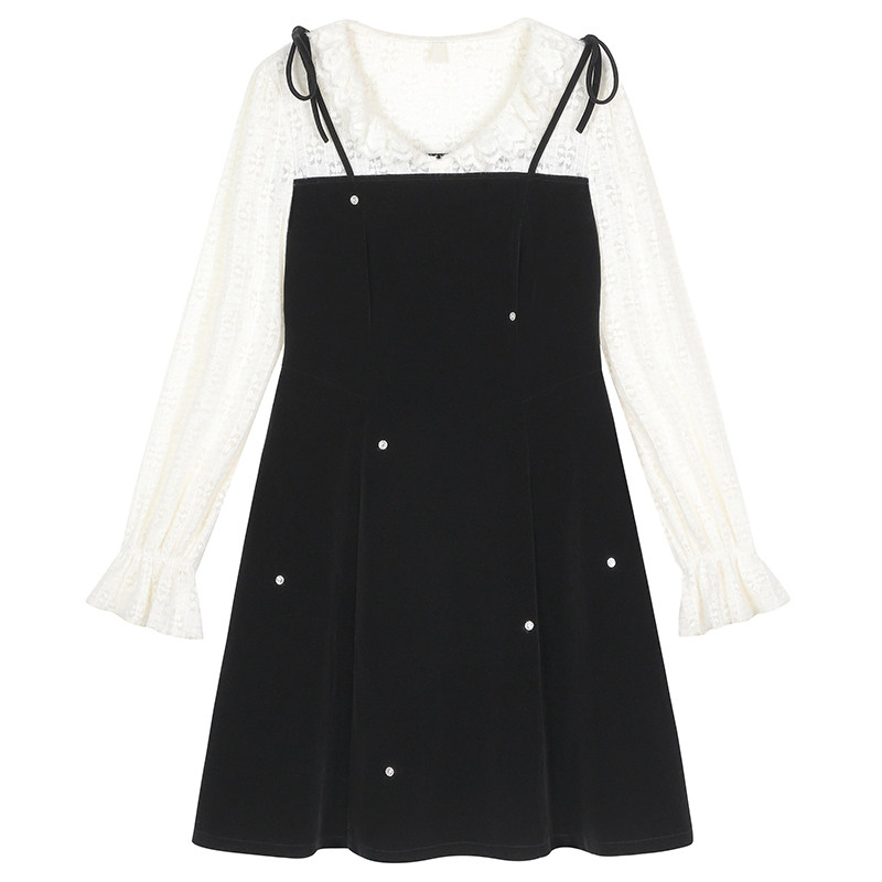 胖莹莹大码女装法式复古高级感丝绒假两件镶钻气质黑色短款连衣裙