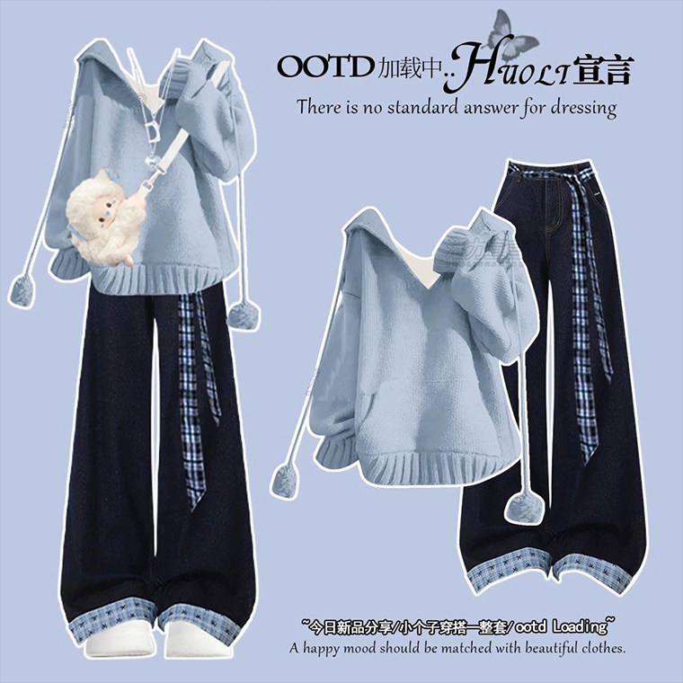 2025冬款套装学生新款初中生女装加厚毛衣时尚加绒牛仔裤两件套