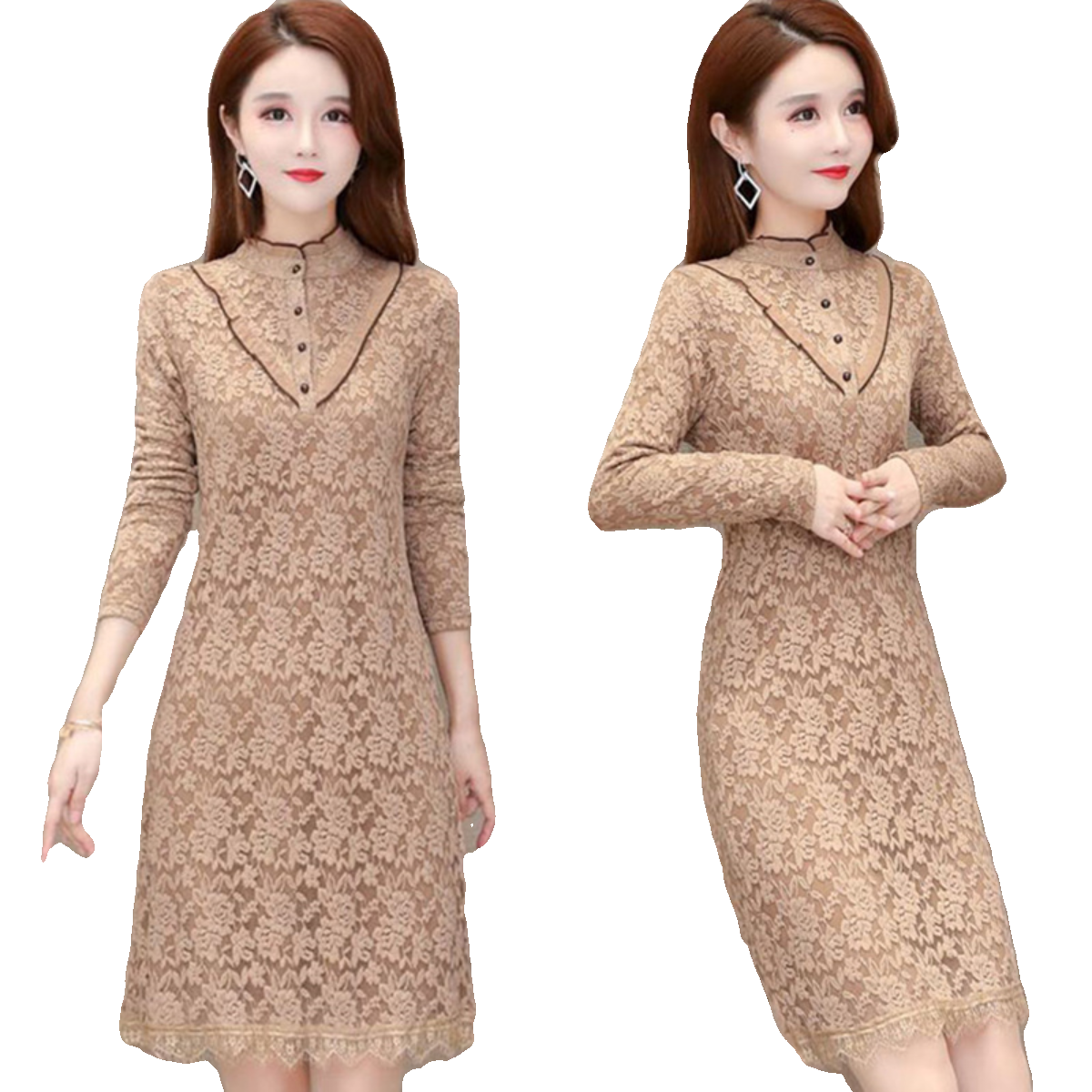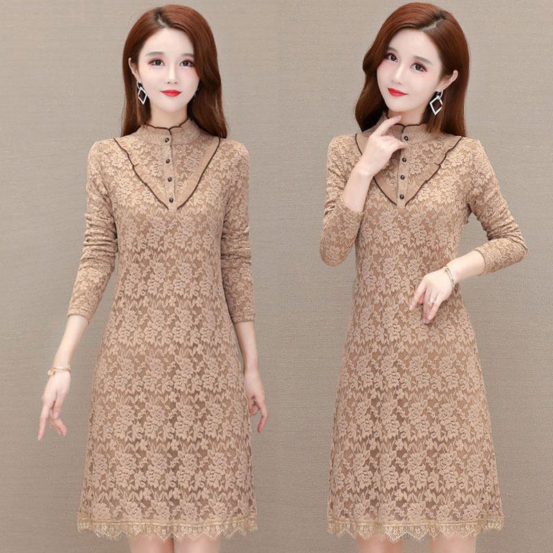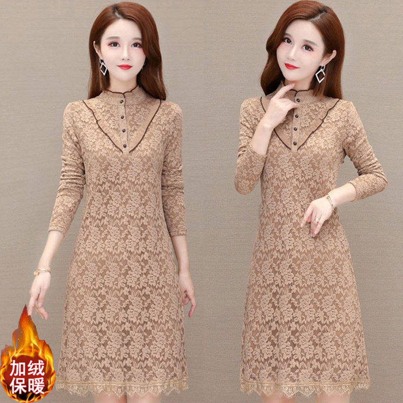 加绒加厚立领蕾丝连衣裙秋冬小个子妈妈遮肚气质配大衣包臀打底