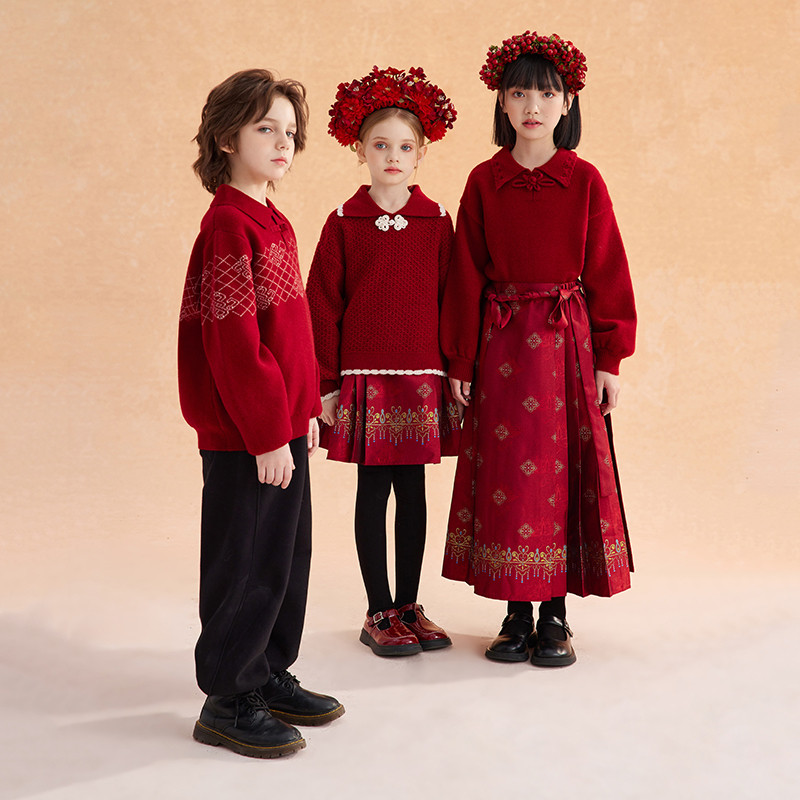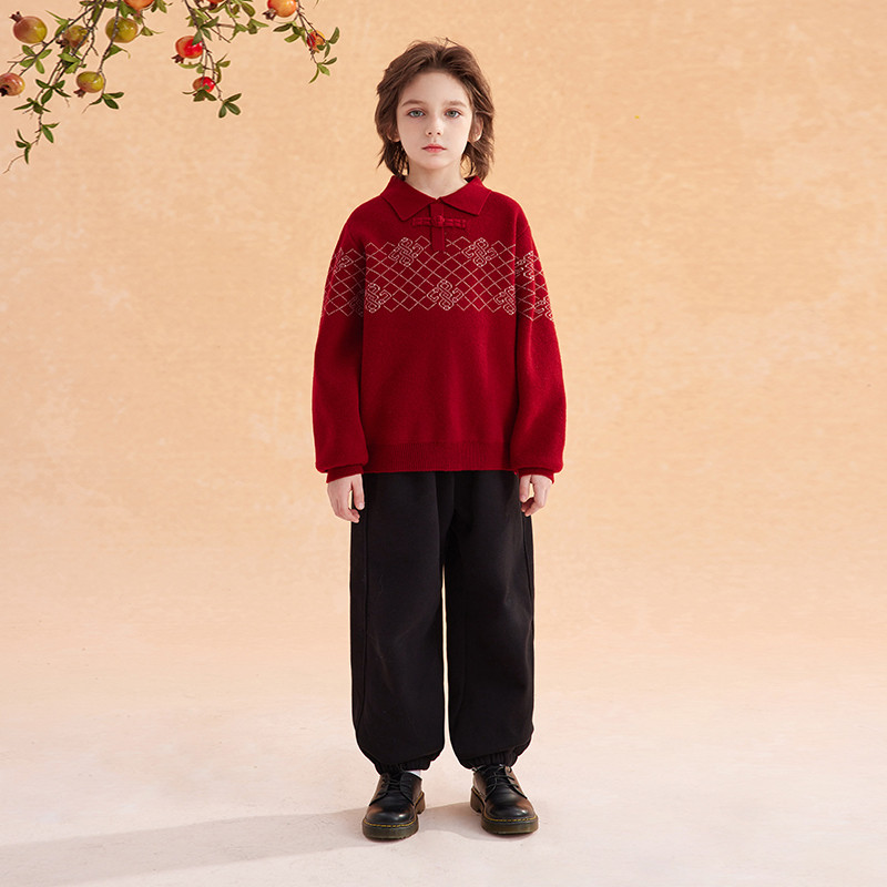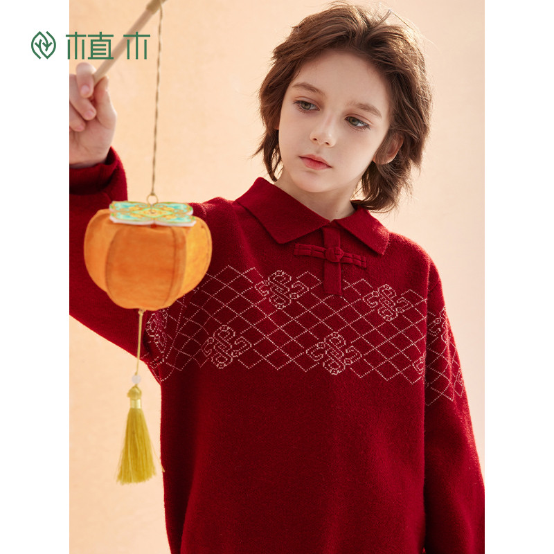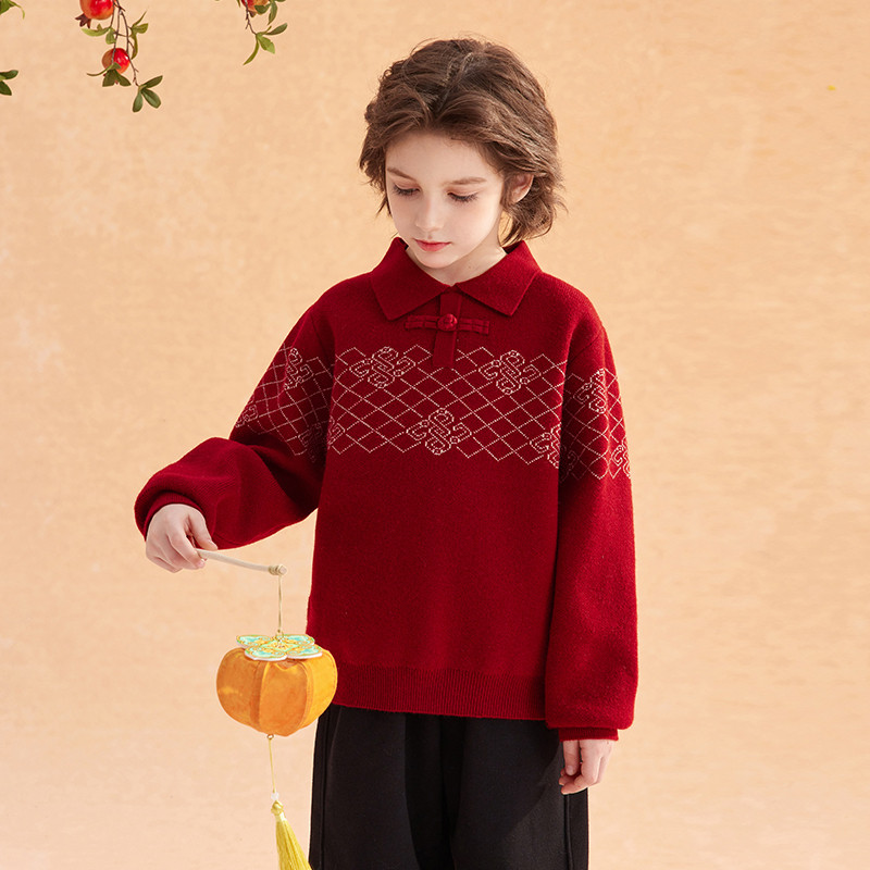 311线报网描述:男童新中式翻领盘扣毛衣兄妹装新年红色年服