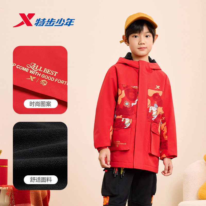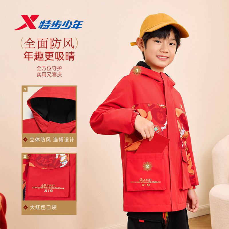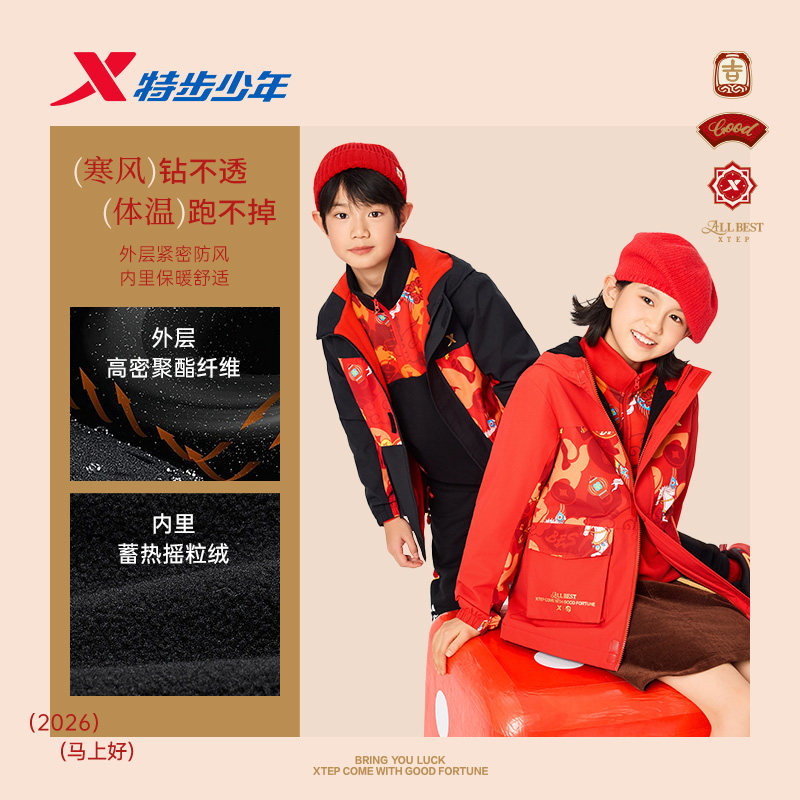 福燈贺岁|特步童装儿童套装男童冬季新年服红色加绒拜年外套裤子