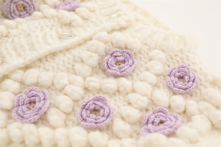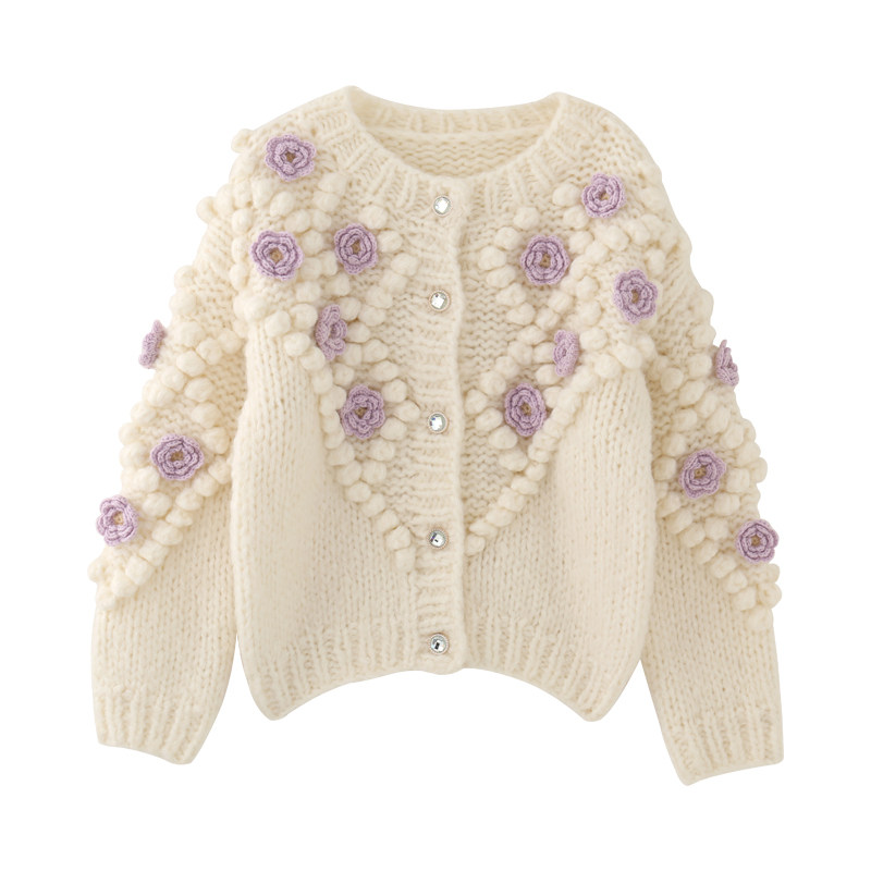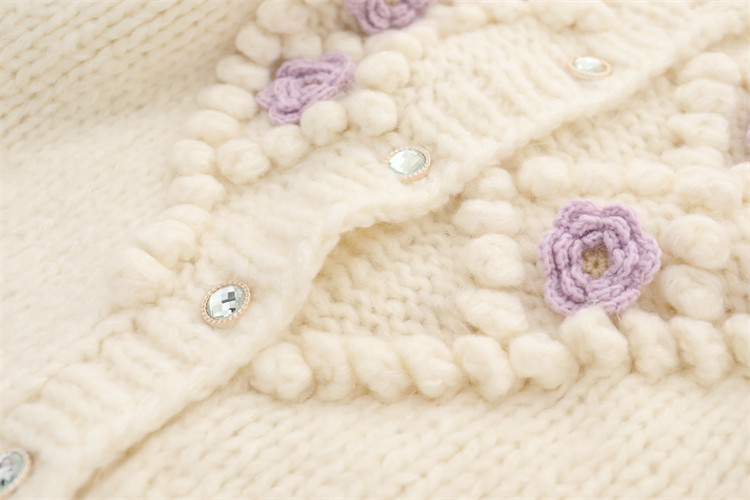 2026早春新款加厚棒针开衫女小清新手工钩花豆豆短款直筒毛衣外套