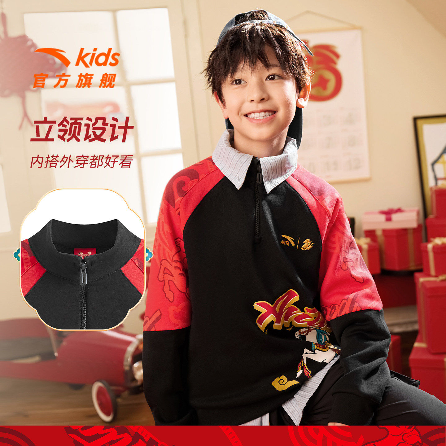 【红色新年马年】安踏儿童卫衣男童2026年加绒拉链宝宝拜年衣服