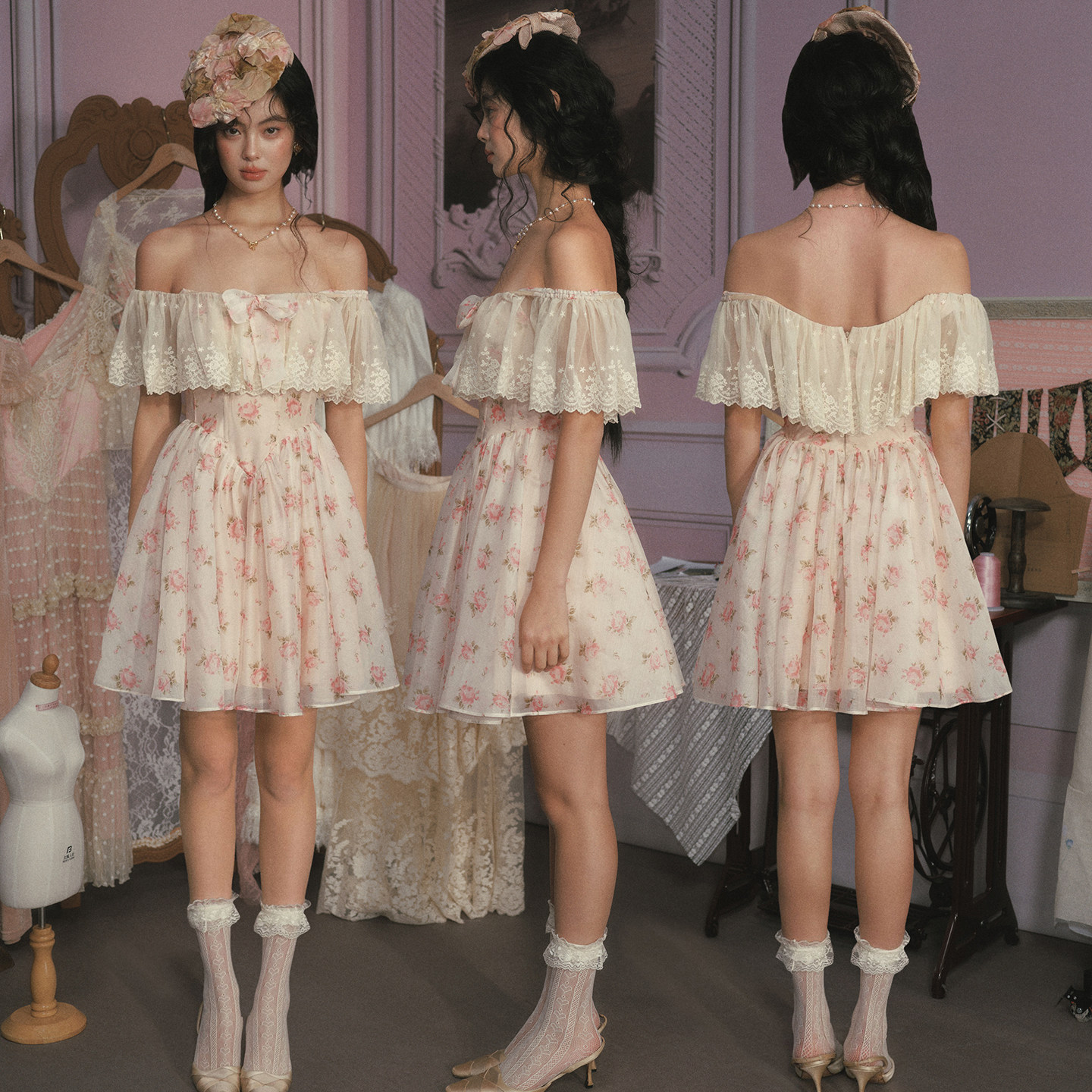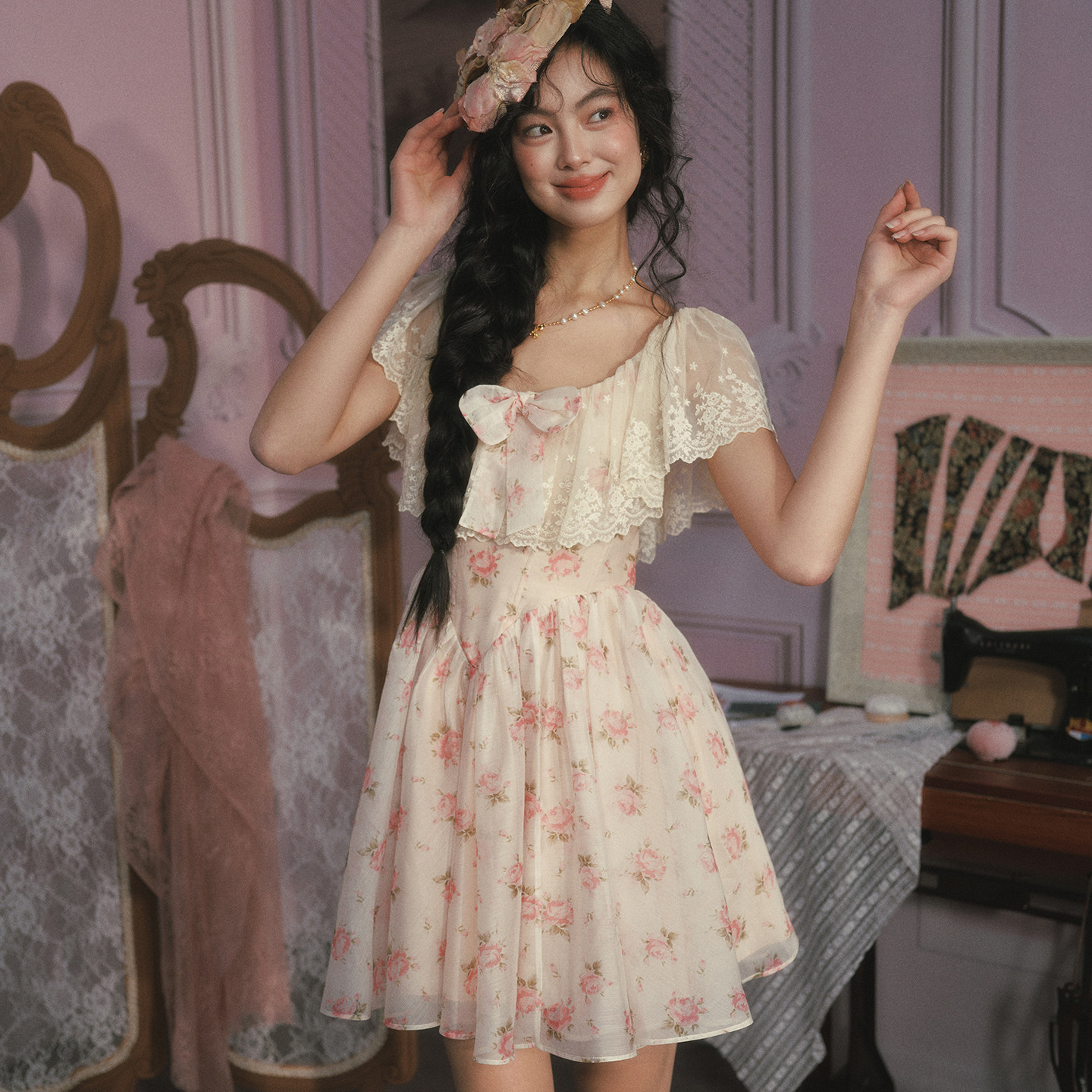 LaceMade 小茜茜公主 法式甜美公主裙粉色短款鱼骨连衣裙小个子女