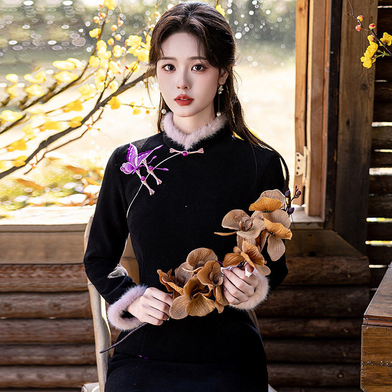 冬款加绒加厚黑色短款长袖旗袍2026新款年轻款女小个子连衣裙冬季