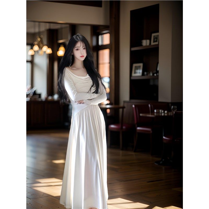 法式白色荡领针织连衣裙女秋季高级感气质长袖露肩收腰a字长裙子