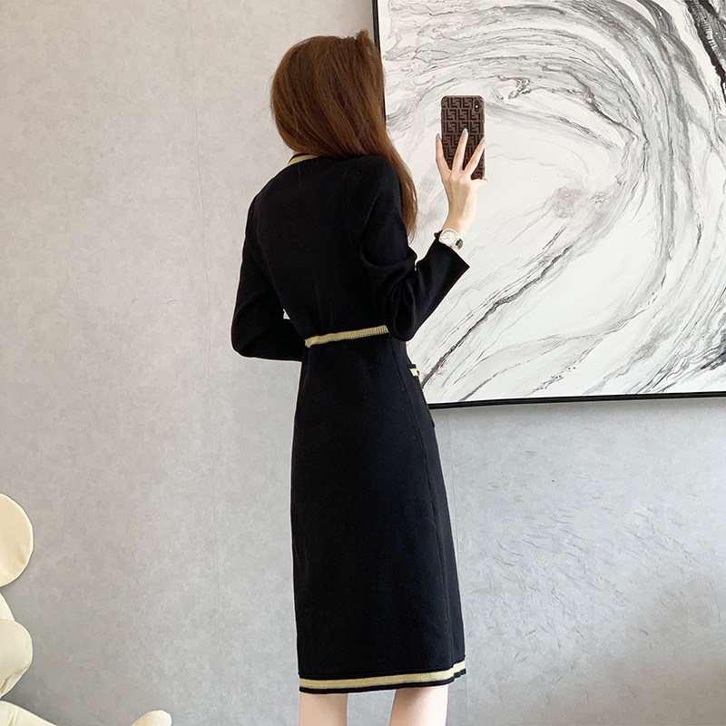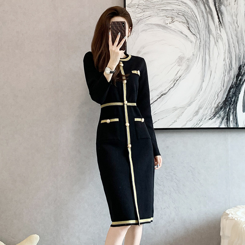 小香风长款修身针织连衣裙女2025春秋季新款长袖打底赫本小黑裙子