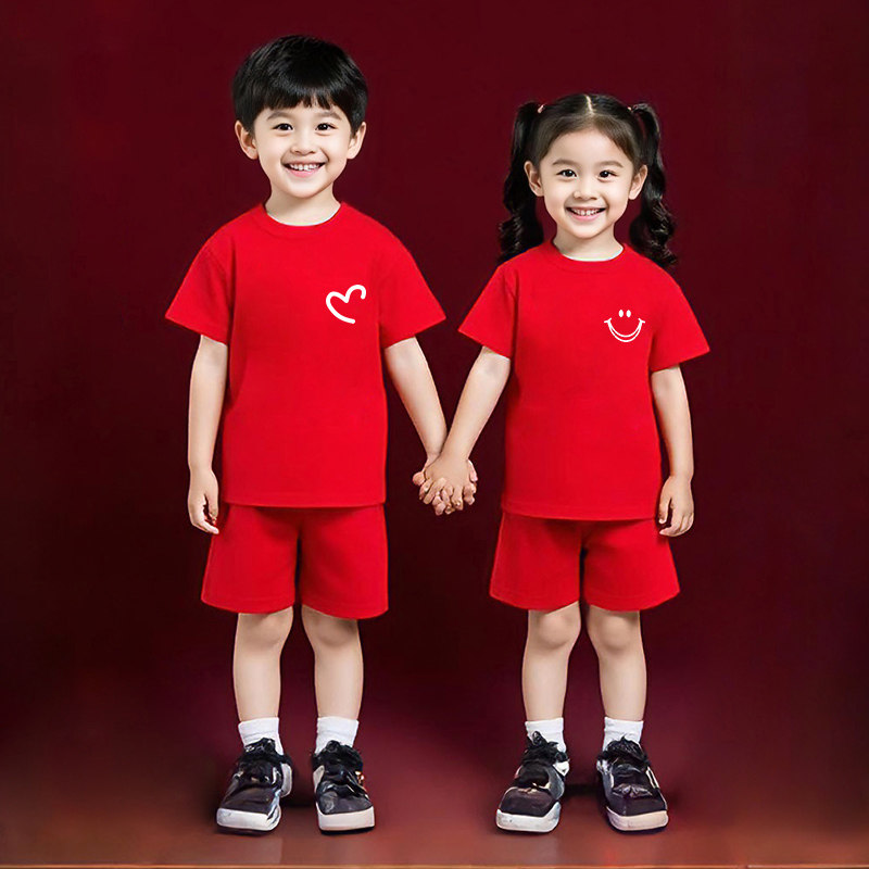 儿童红色短袖套装亲子装一家三口半袖男童生日衣服女童本命年服装