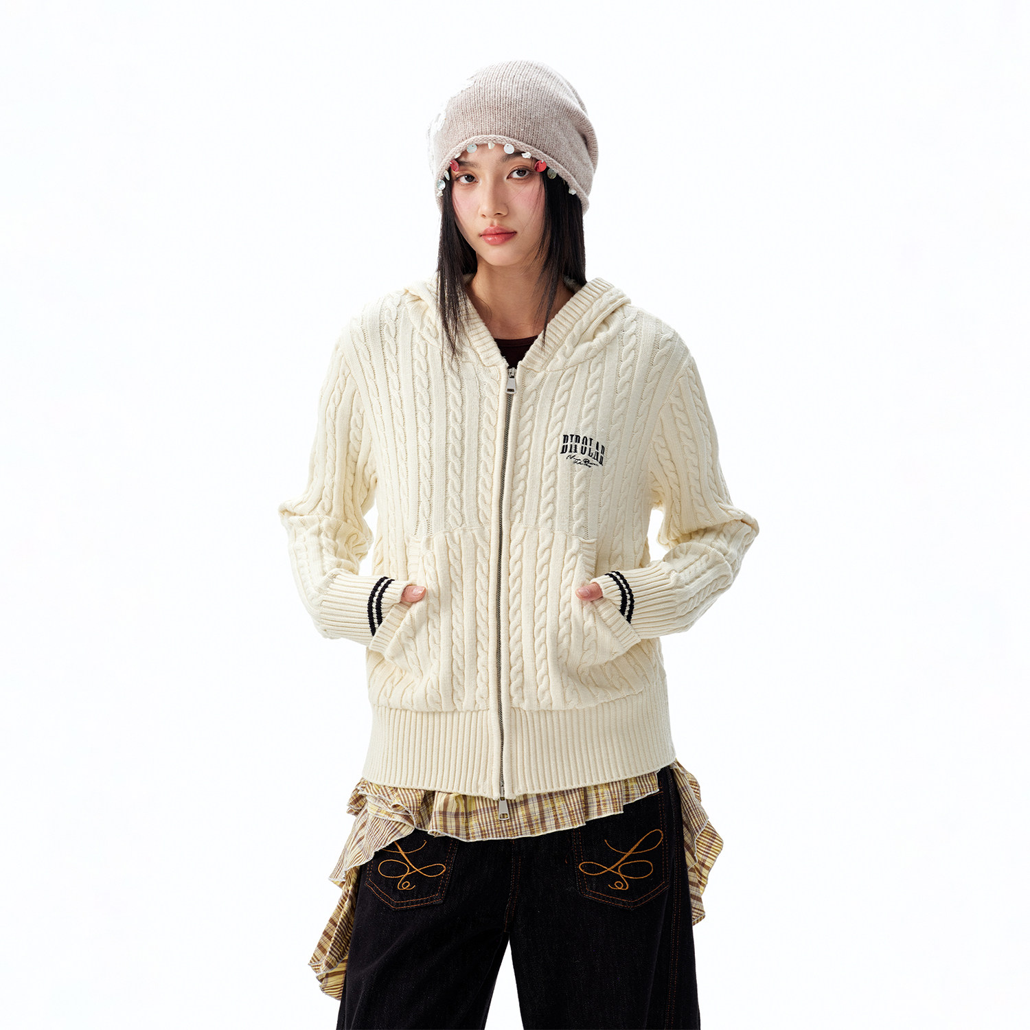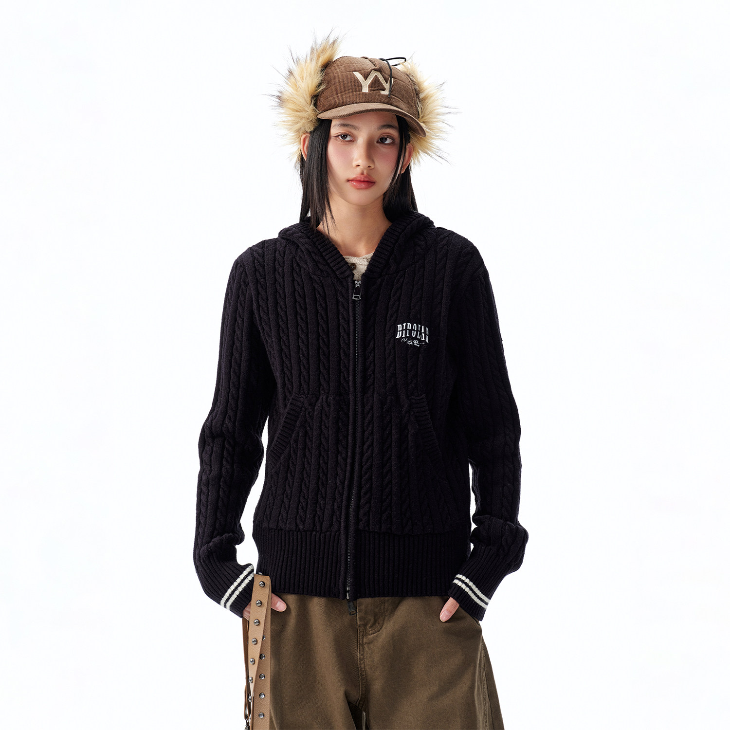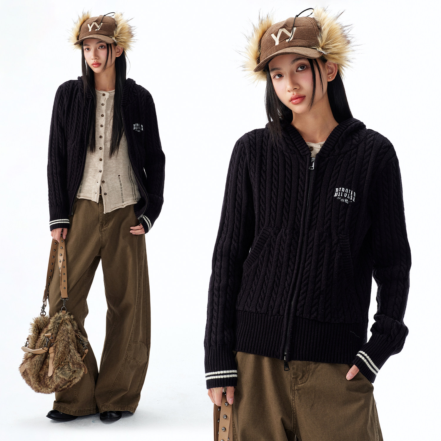 BIPOLAR麻花纹连帽毛衣针织开衫韩系修身显瘦内搭上衣秋冬女款