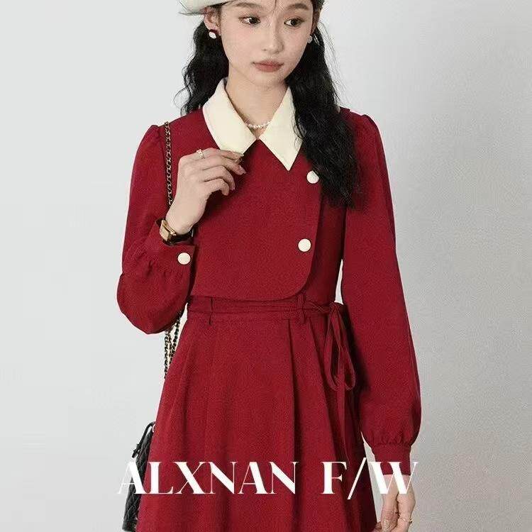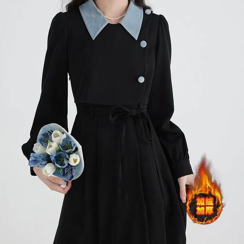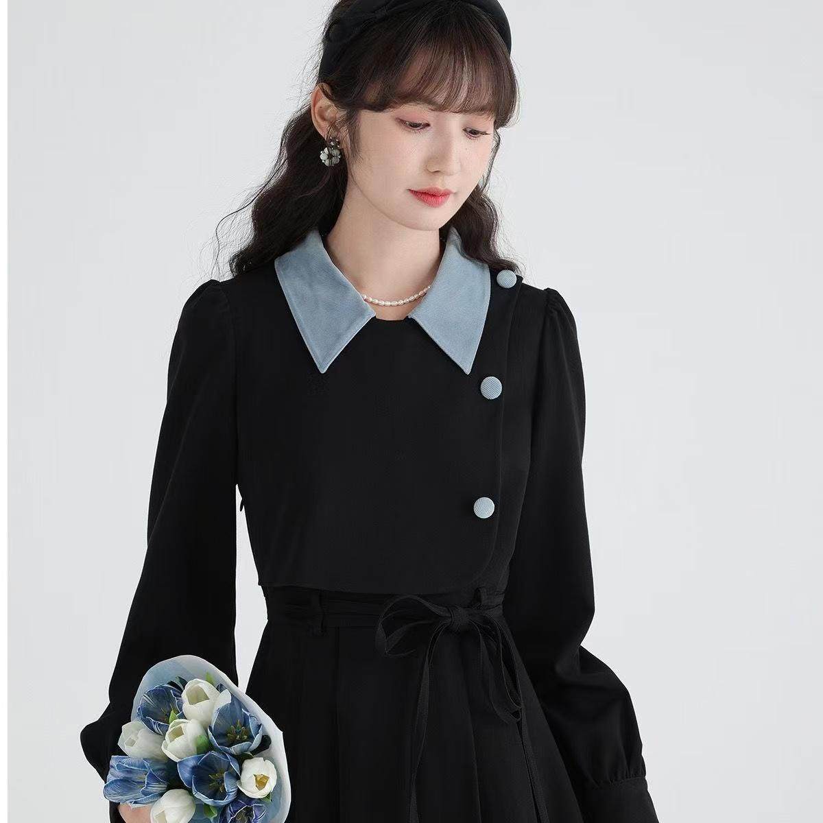 法式桔梗假两件连衣裙秋冬款长袖收腰显瘦连衣裙气质垂感通勤穿搭