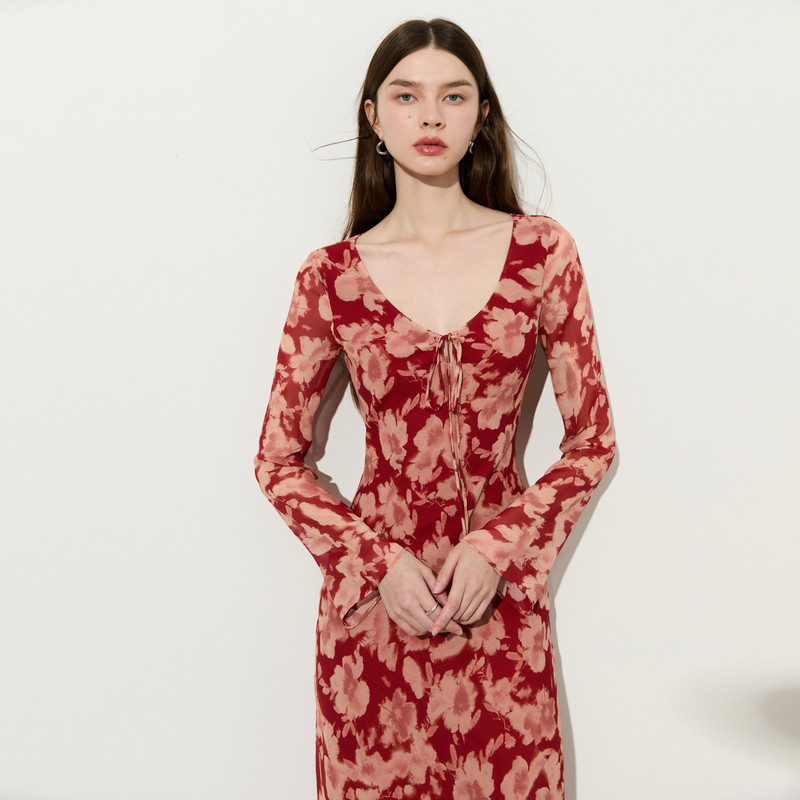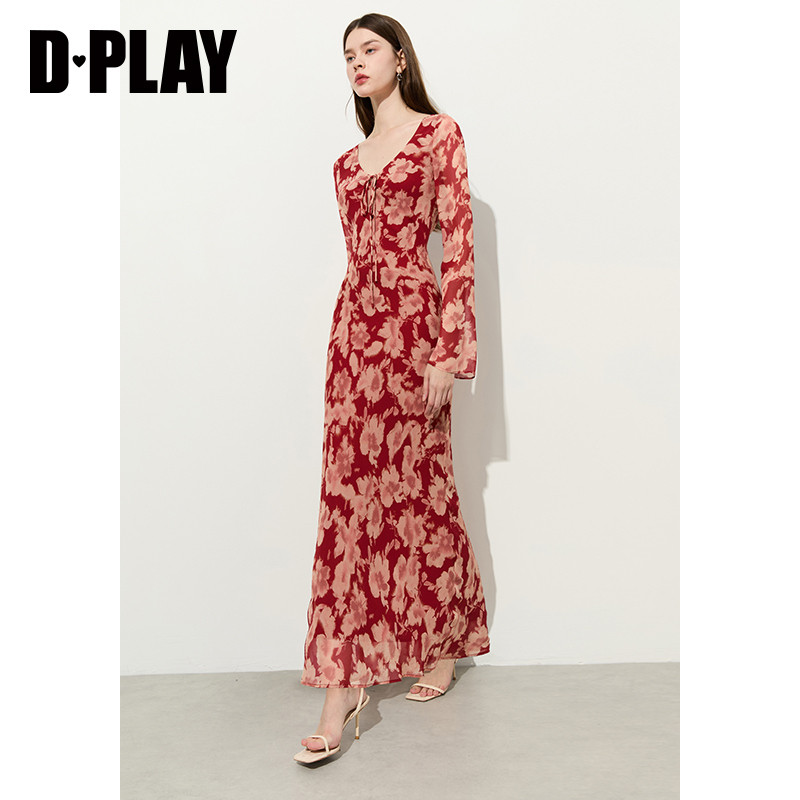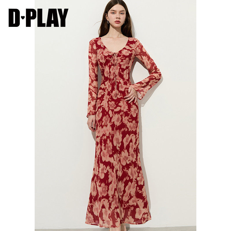 DPLAY红色连衣裙2026年春季新款印花系带法式时尚度假长裙女