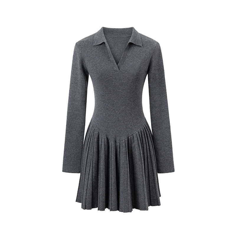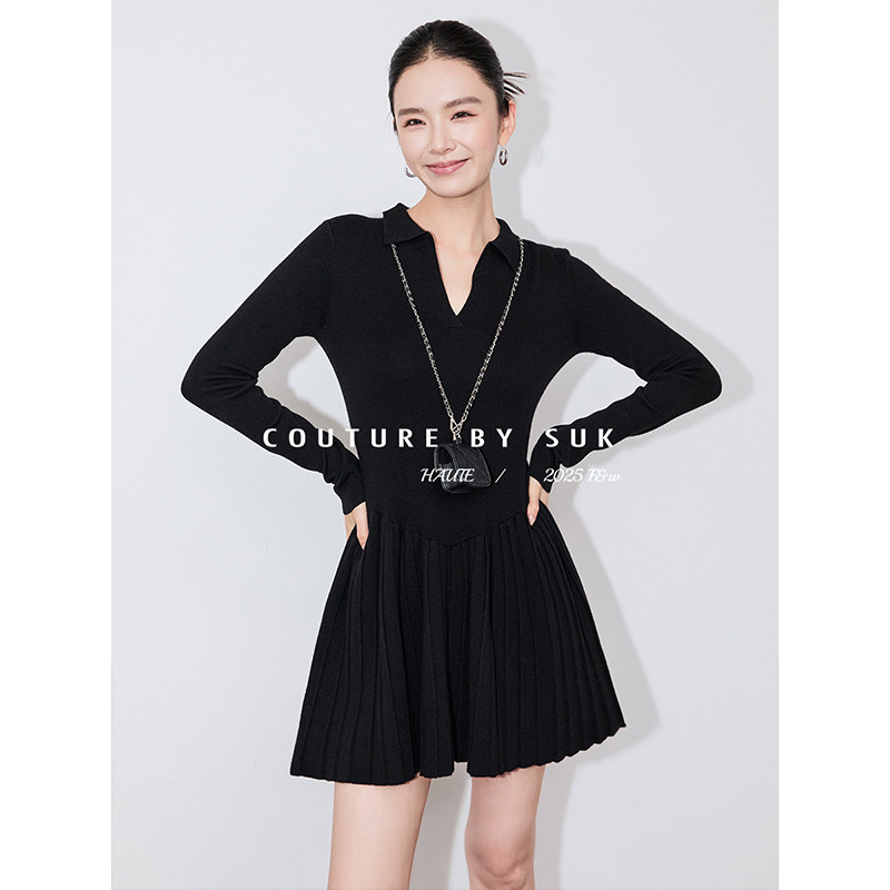 SUK 气质加分项!羊毛混纺时髦poloV领重工百褶针织长袖连衣裙女