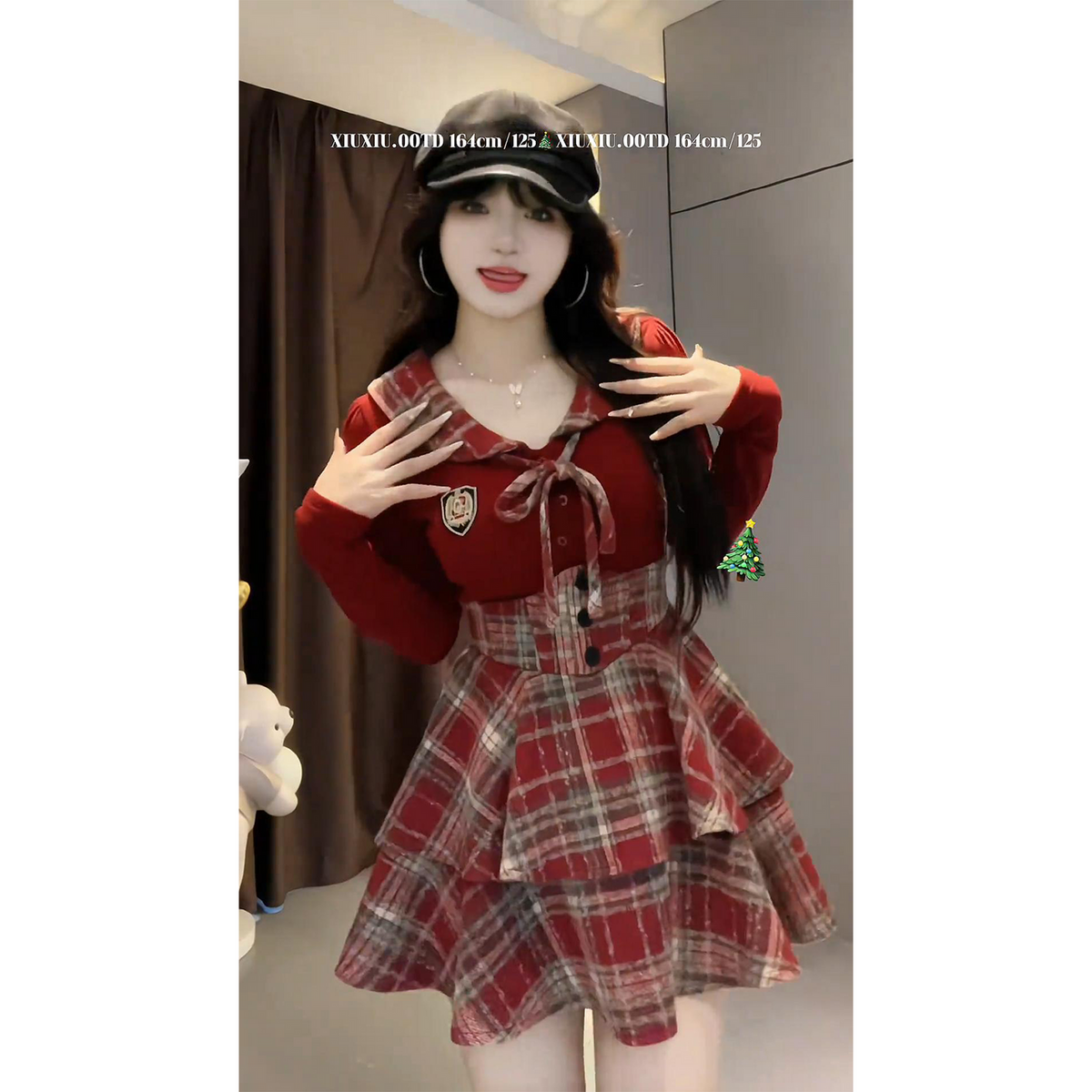 法式红色格纹长袖连衣裙子女秋冬季2025新款高级感小个子香风套装