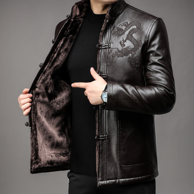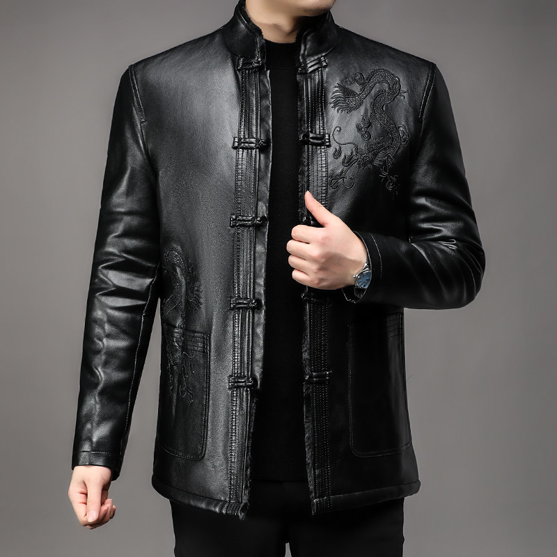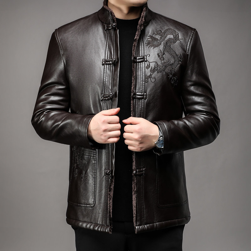 真皮皮衣男唐装皮毛一体中年海宁皮夹克加绒加厚中老年外套爸爸装