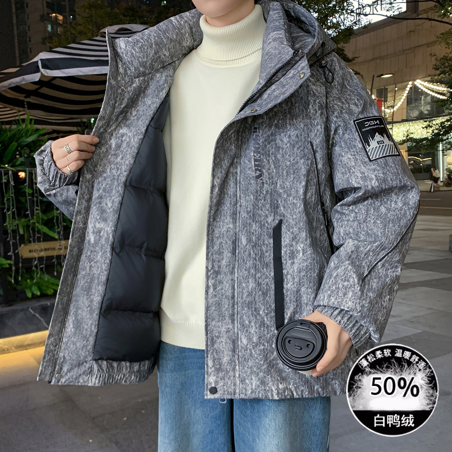 连帽羽绒服男士冬季高级感痞帅宽松休闲加厚外套男生白鸭绒冲锋衣