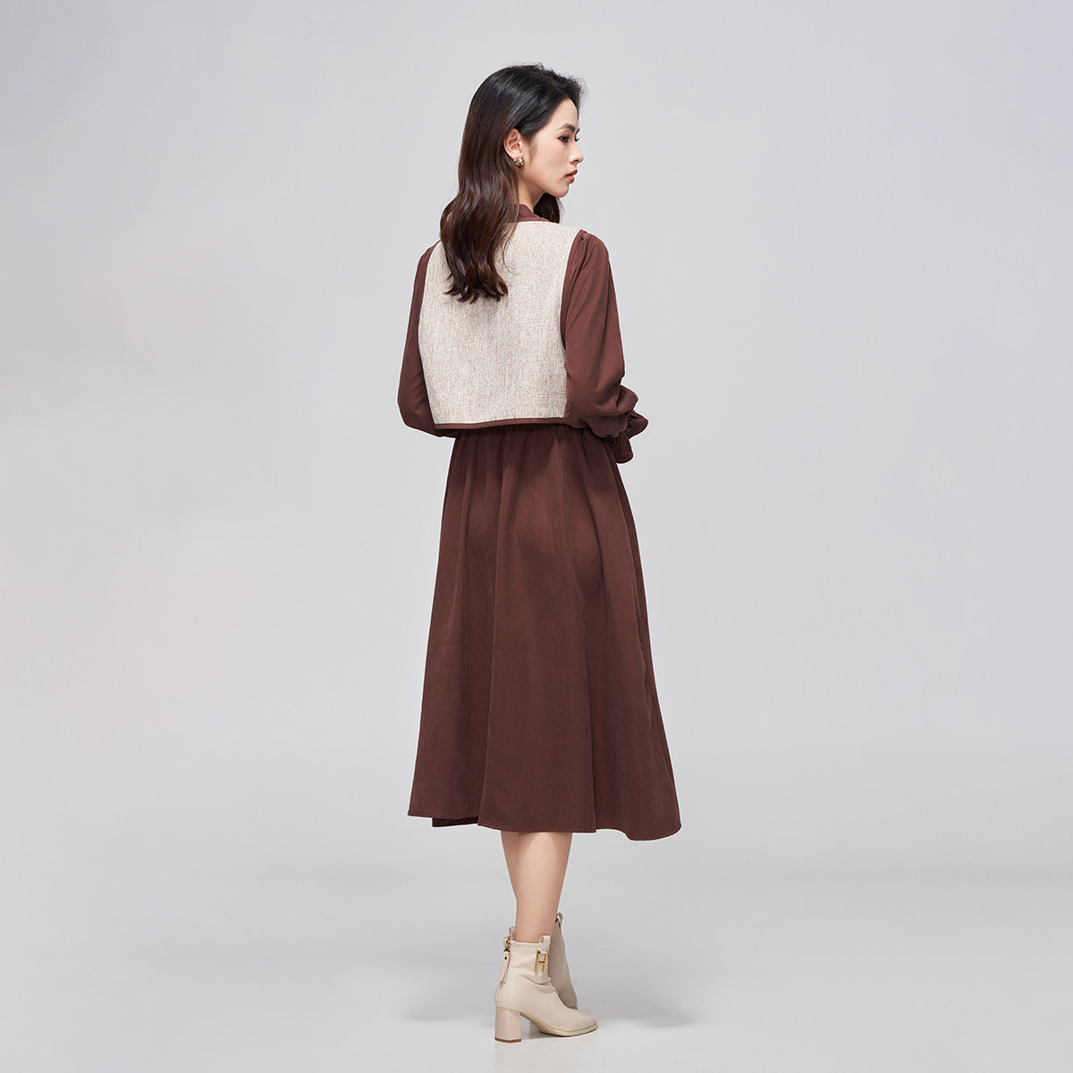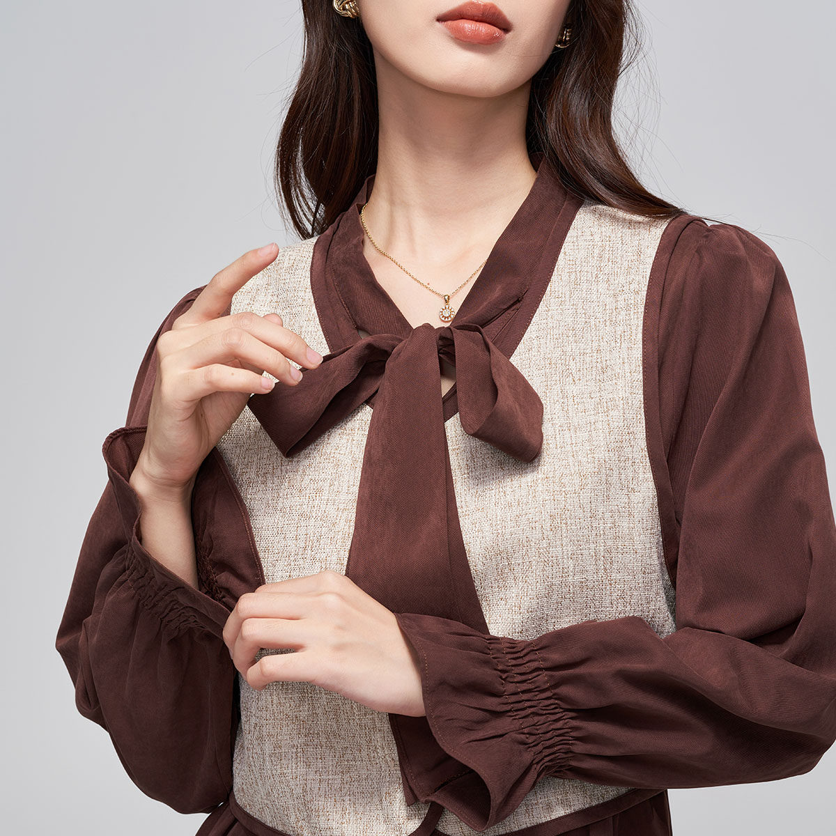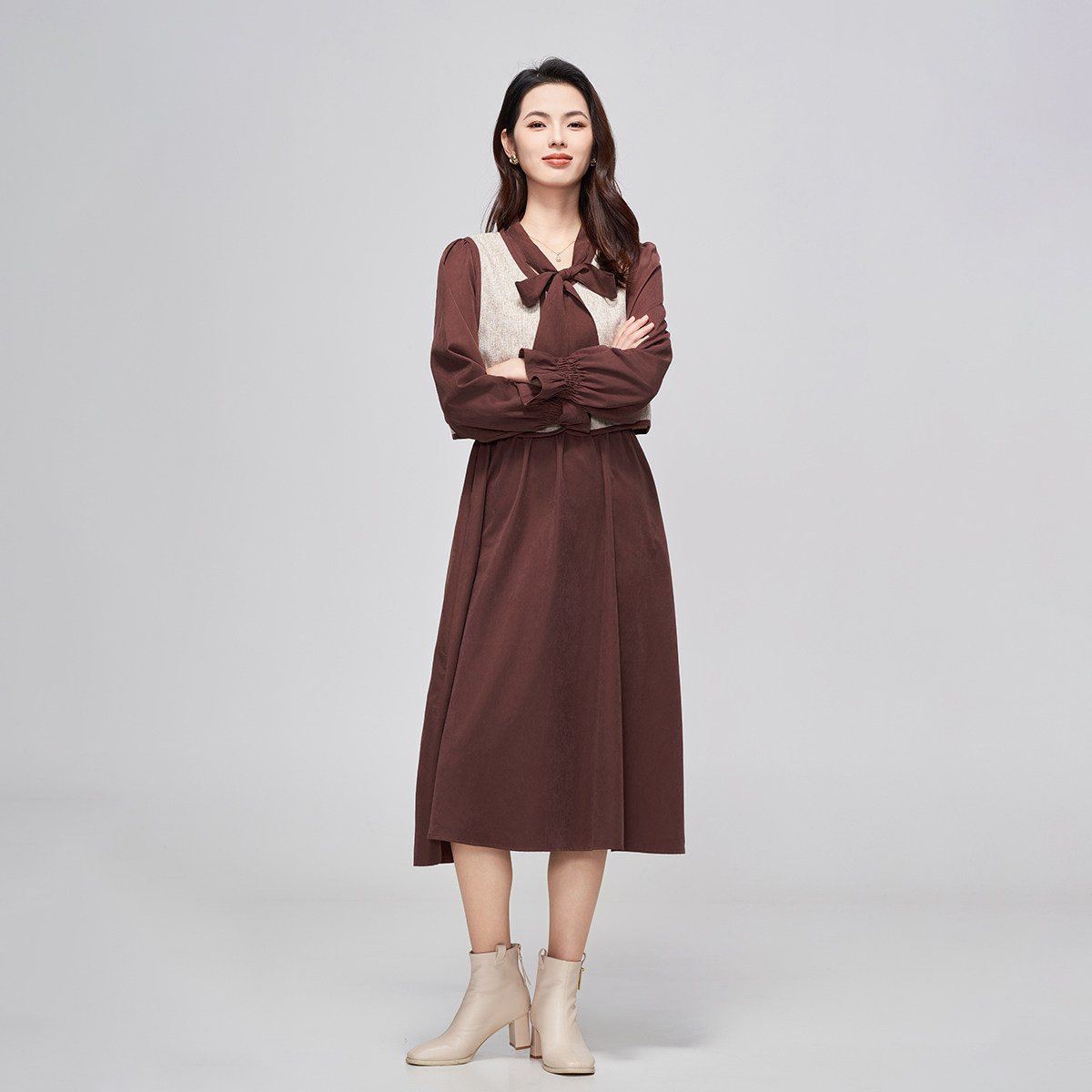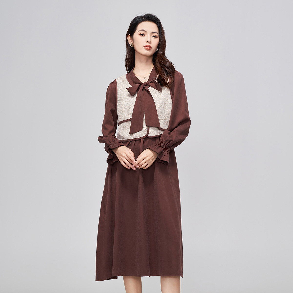 马天奴秋冬咖啡色马甲飘带领连衣裙子套装时尚女装气质复古百搭