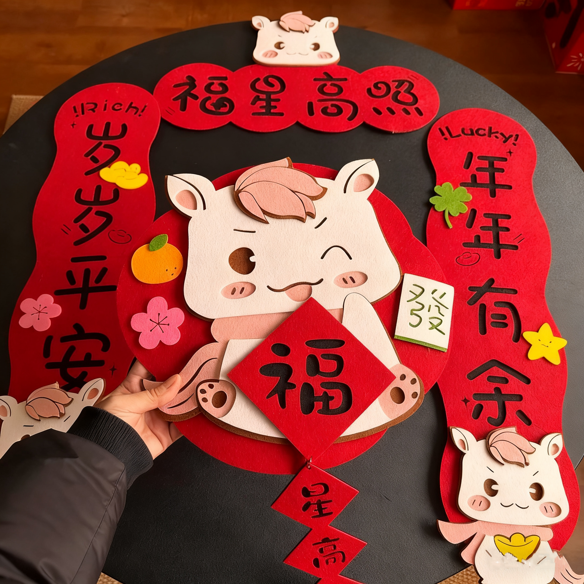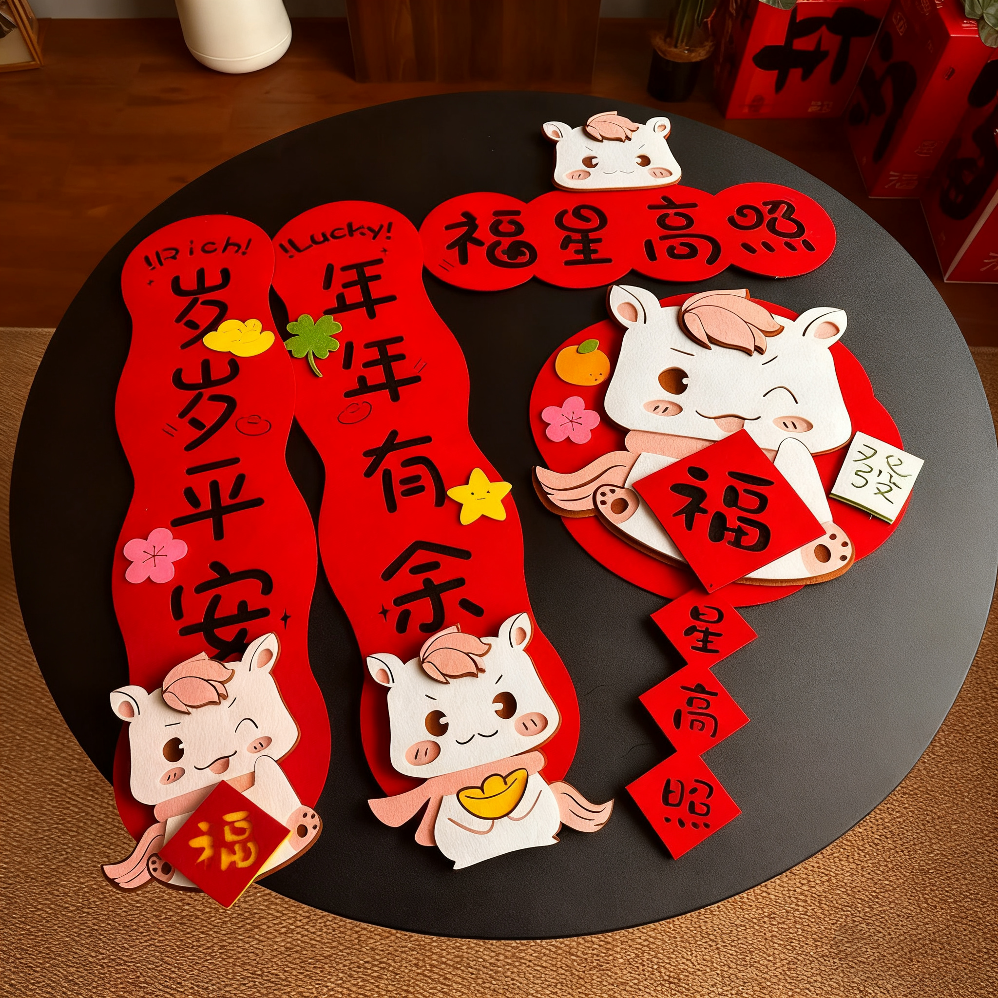 2026马年卡通可爱创意磁吸对联毛毡春节立体装饰珲春春联福字门贴