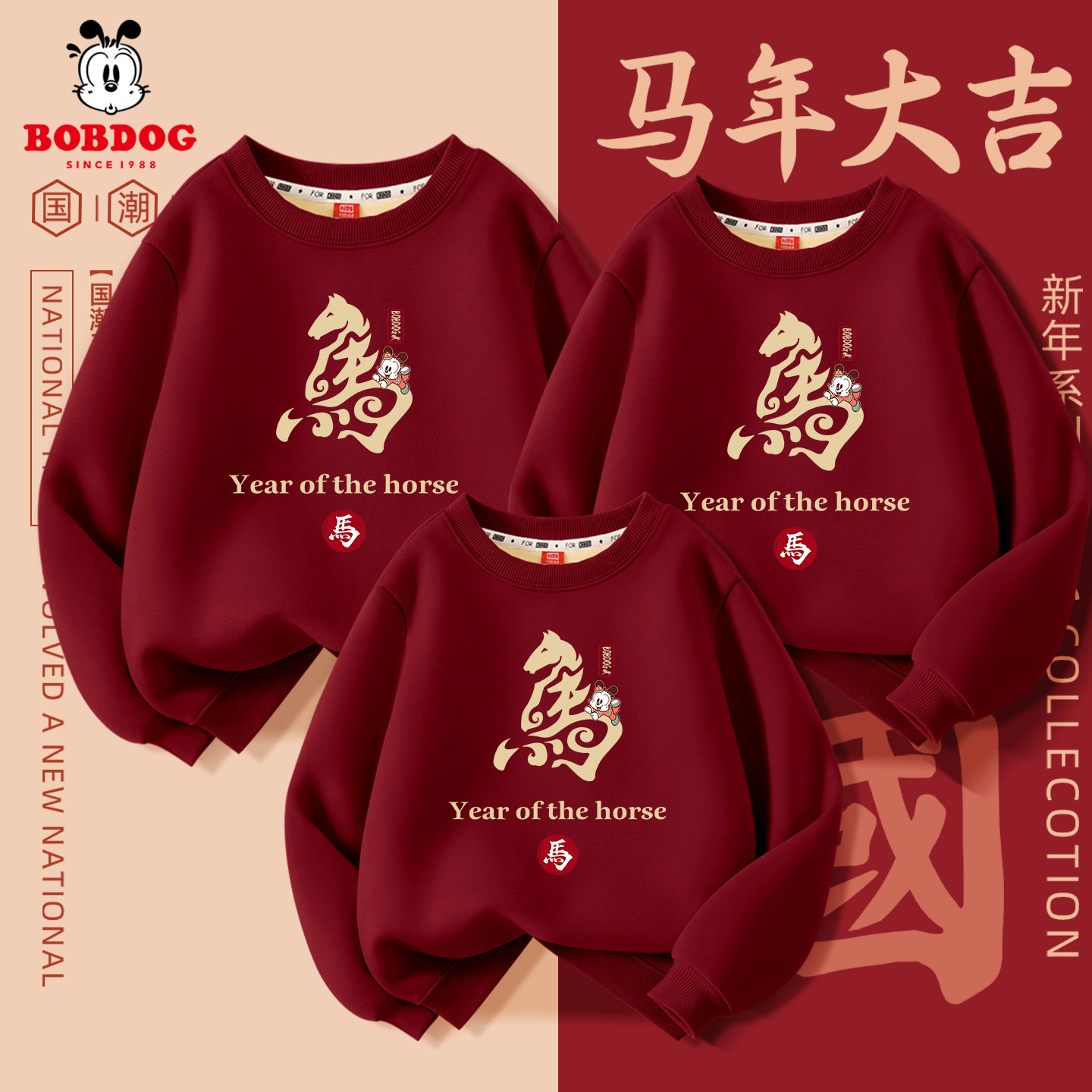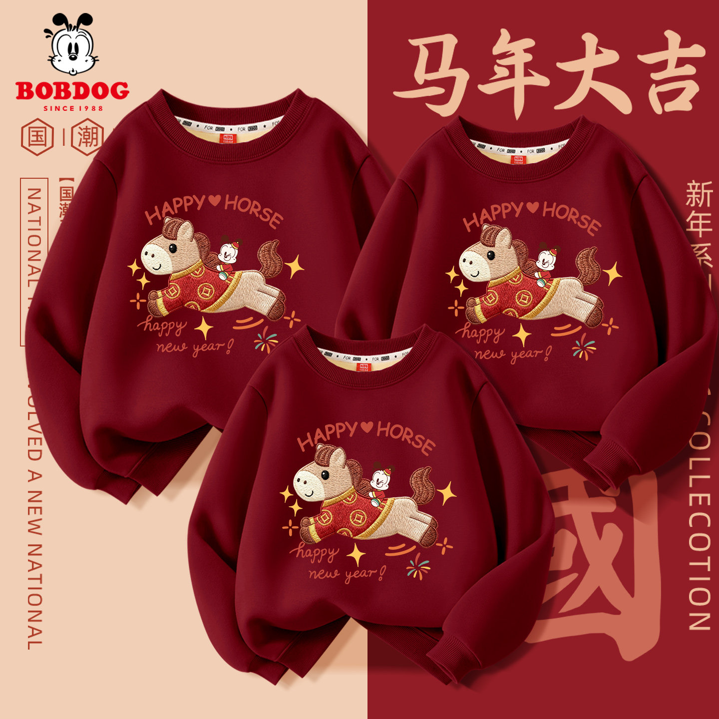 巴布豆亲子装儿童新年款2026马年中国风红色女童加绒卫衣男童年服