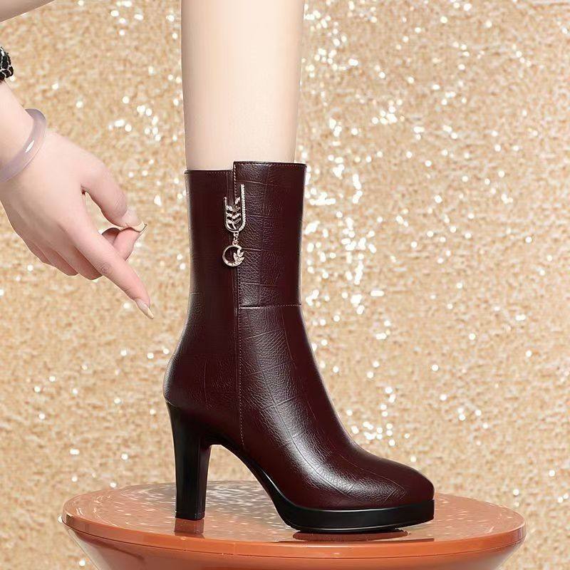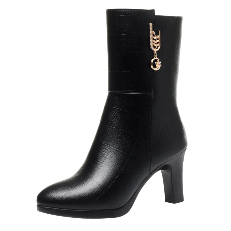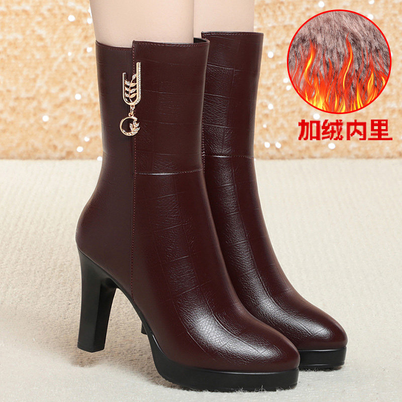 品牌真皮黑色中筒靴女2025新款冬季加绒保暖大棉粗高跟中老年靴子