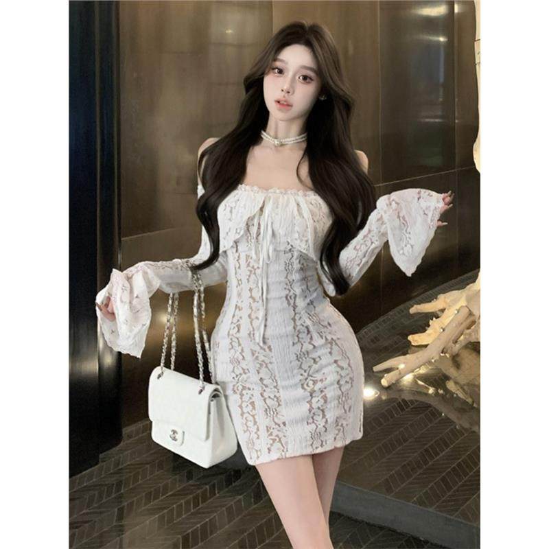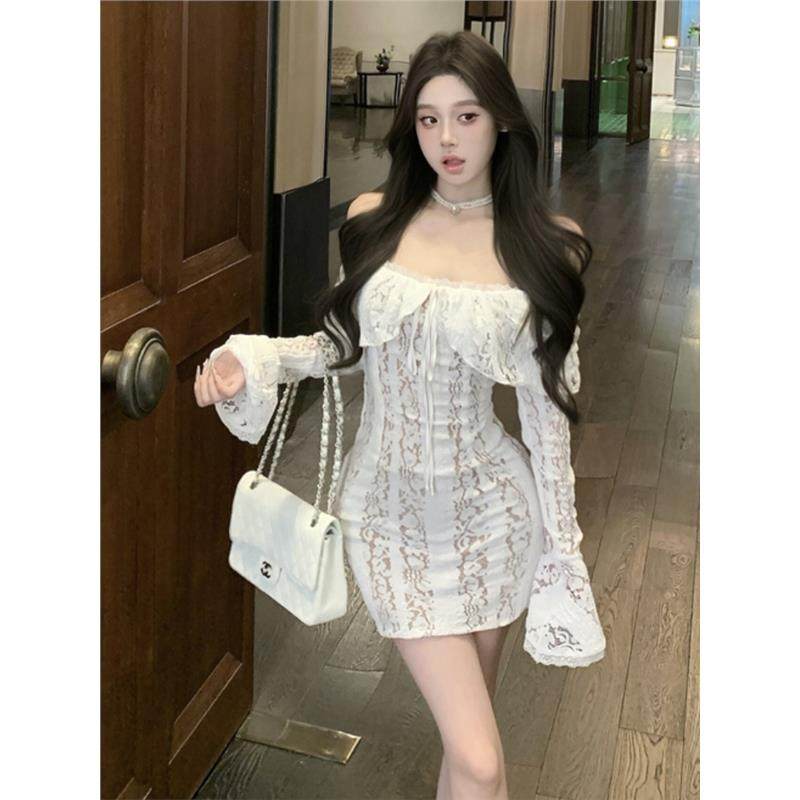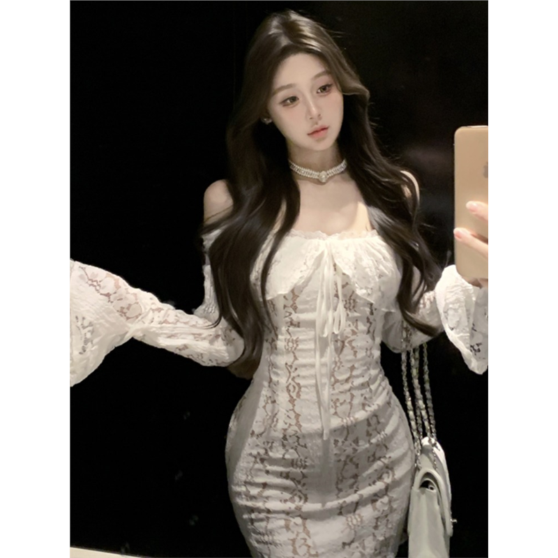 白色一字肩蕾丝长袖连衣裙女秋冬高级性感纯欲收腰修身包臀短裙子