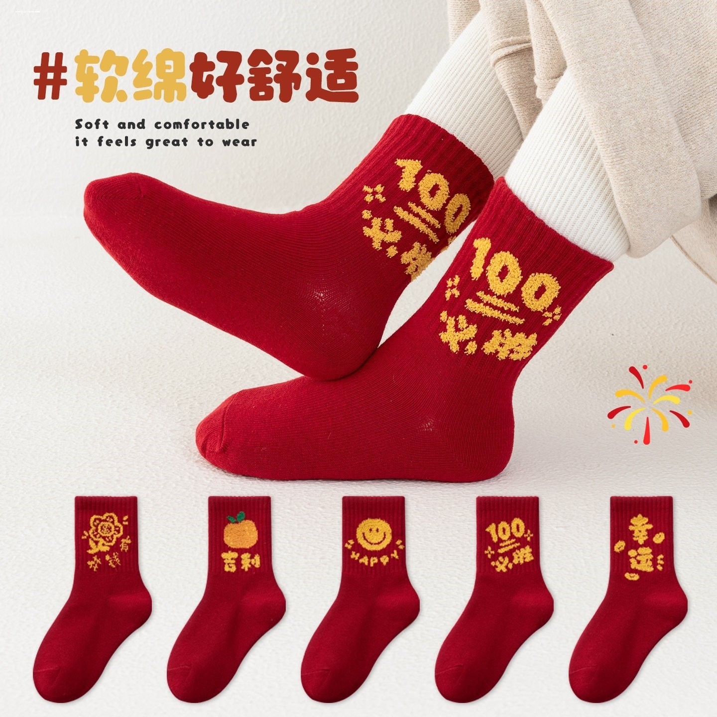 儿童袜子秋冬新年袜马年女男童袜纯棉青少年本命年大红童袜1-12岁