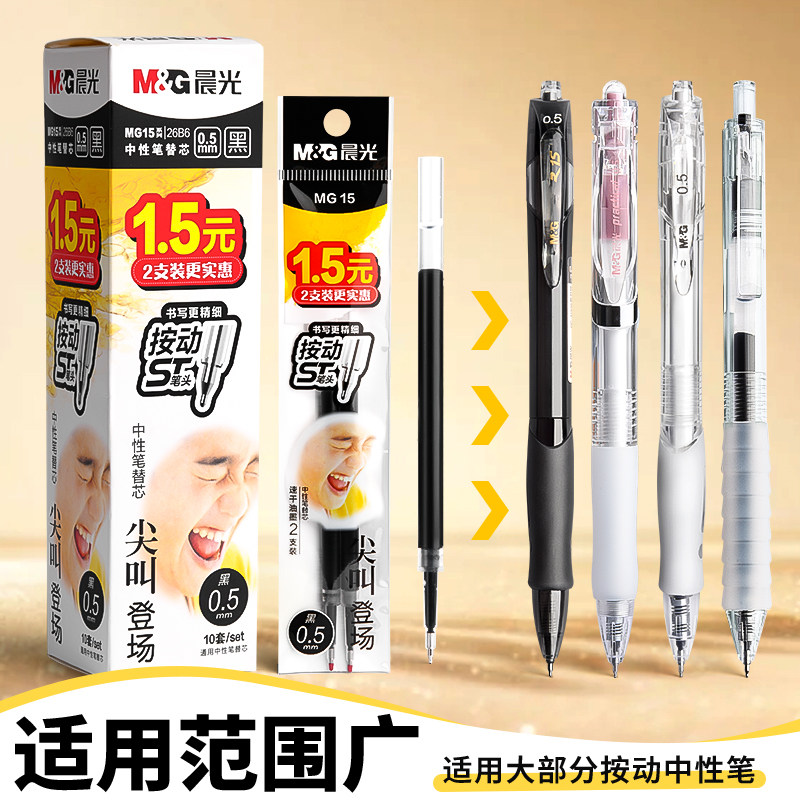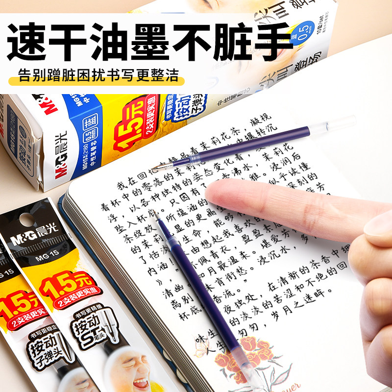 晨光ST笔芯按动笔笔芯官方旗舰店黑色0.5mm中性笔芯st头速干中性笔芯黑笔替芯签字笔替换笔芯圆珠笔g-5笔芯