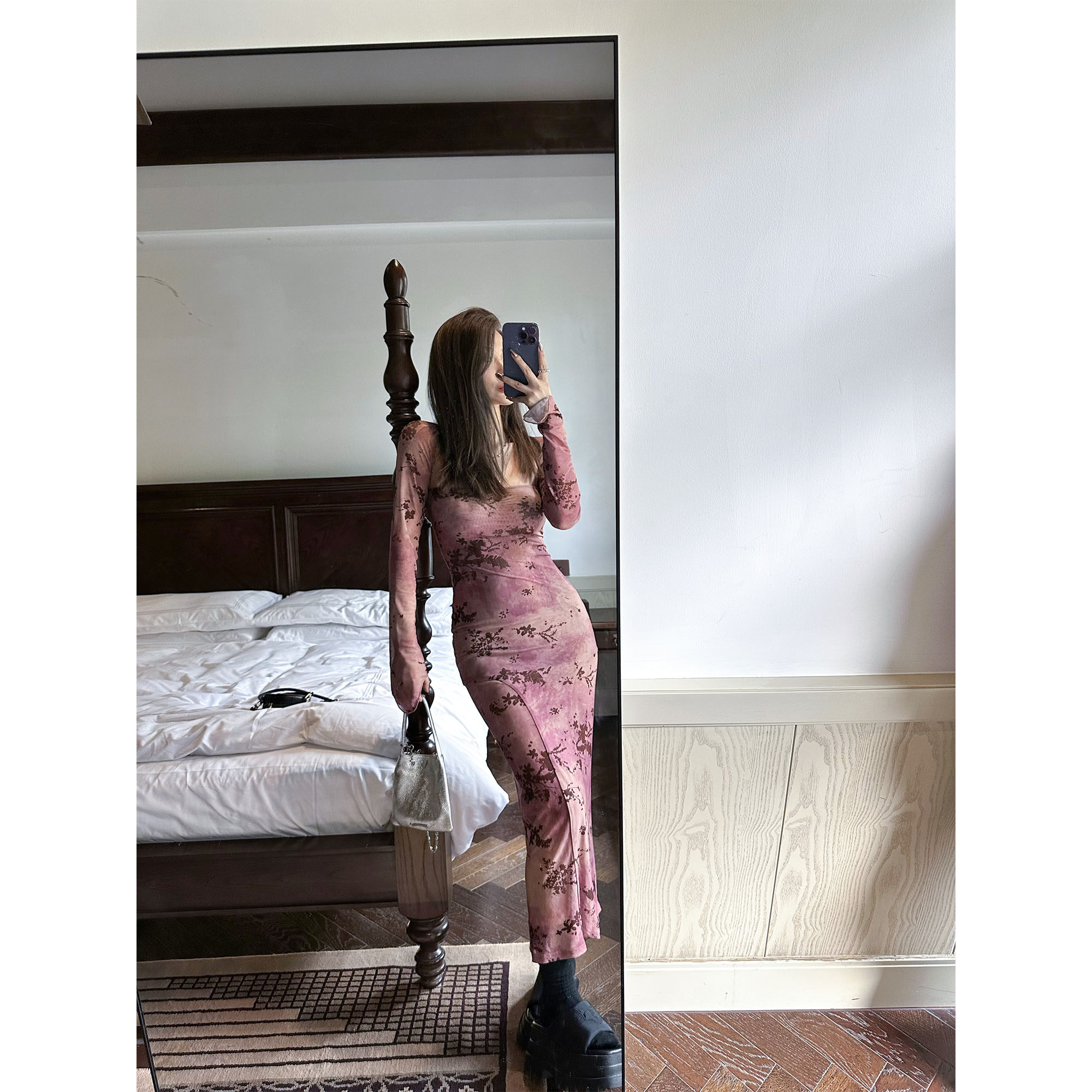 Xinlei Lin “桃之幺幺”春日辣妹印花高弹长袖连衣裙女春夏裙子