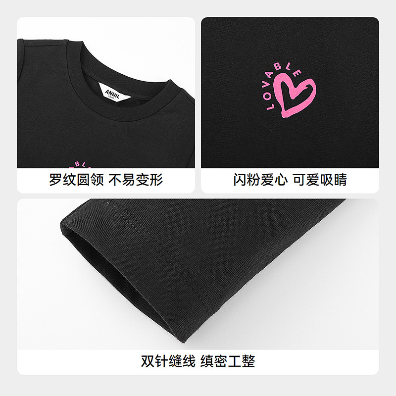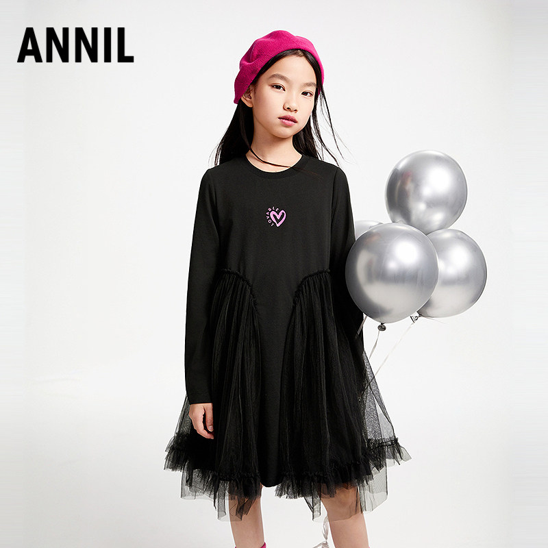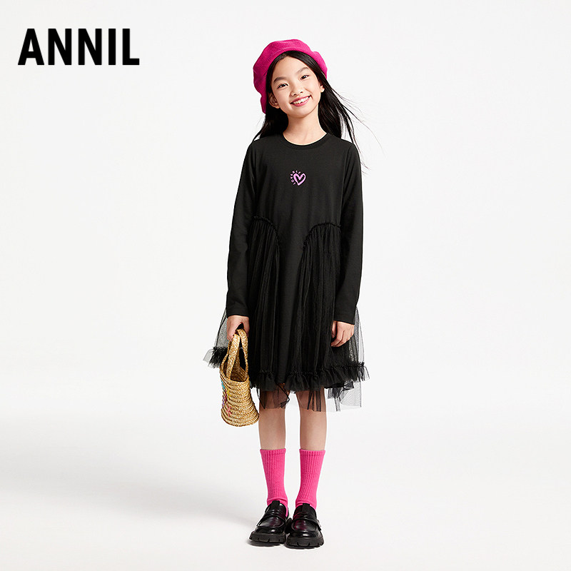 安奈儿童装女童长袖连衣裙2025春新款甜美弹力黑色A字网纱裙子