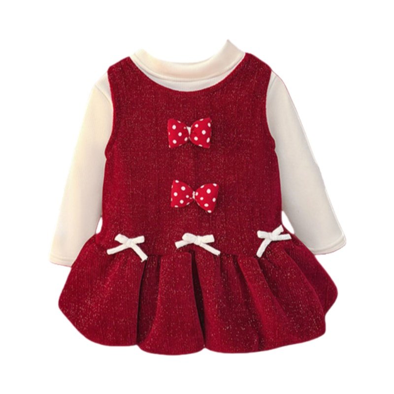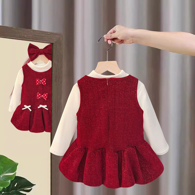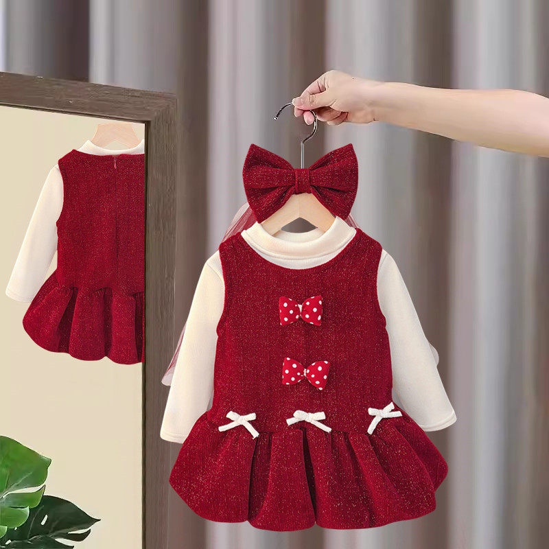 女童连衣裙套装冬装加厚宝宝公主裙蝴蝶结秋冬季2026儿童红色裙子