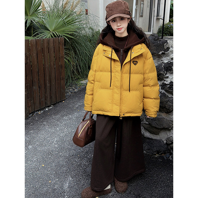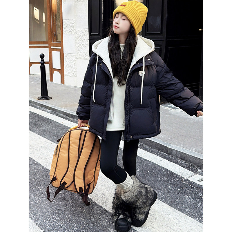 女童2025新款冬季假两件连帽中长款羽绒服初中生加厚保暖外套洋气