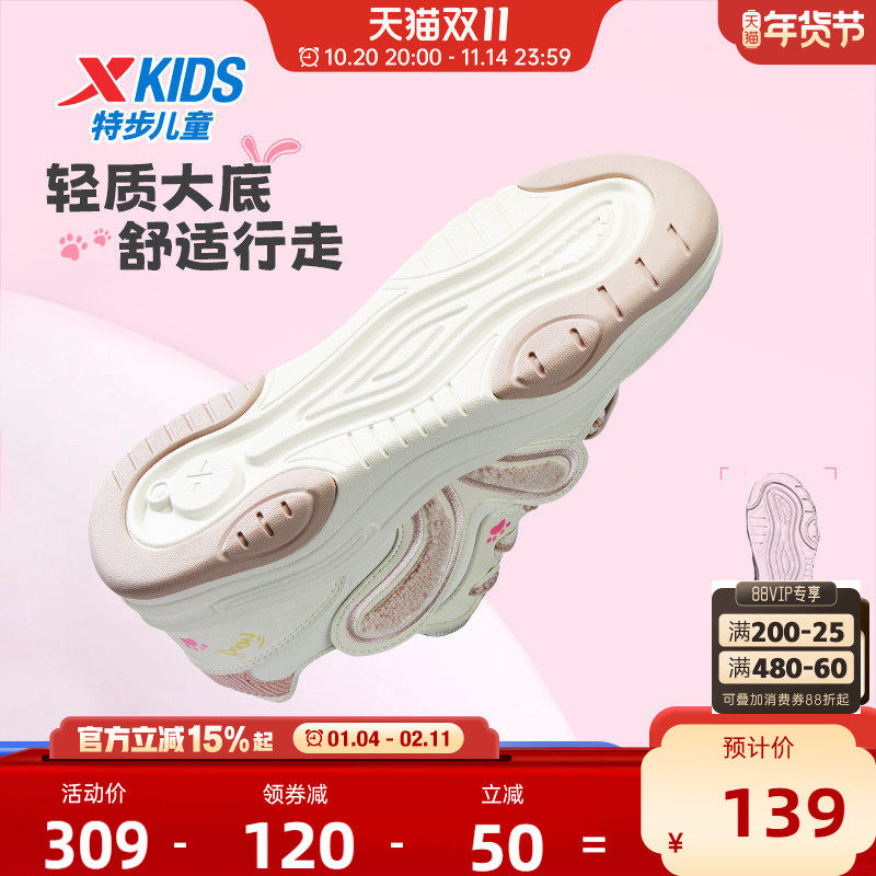 特步童鞋秋冬新款儿童运动板鞋女童防滑耐磨大童魔术贴软底休闲鞋