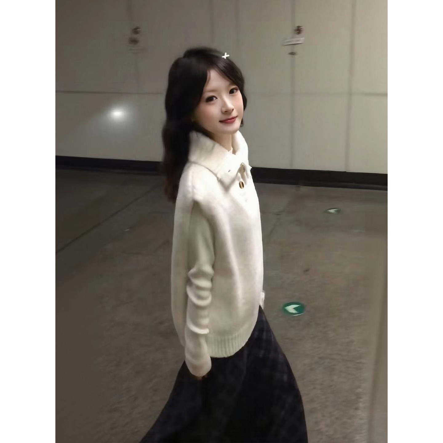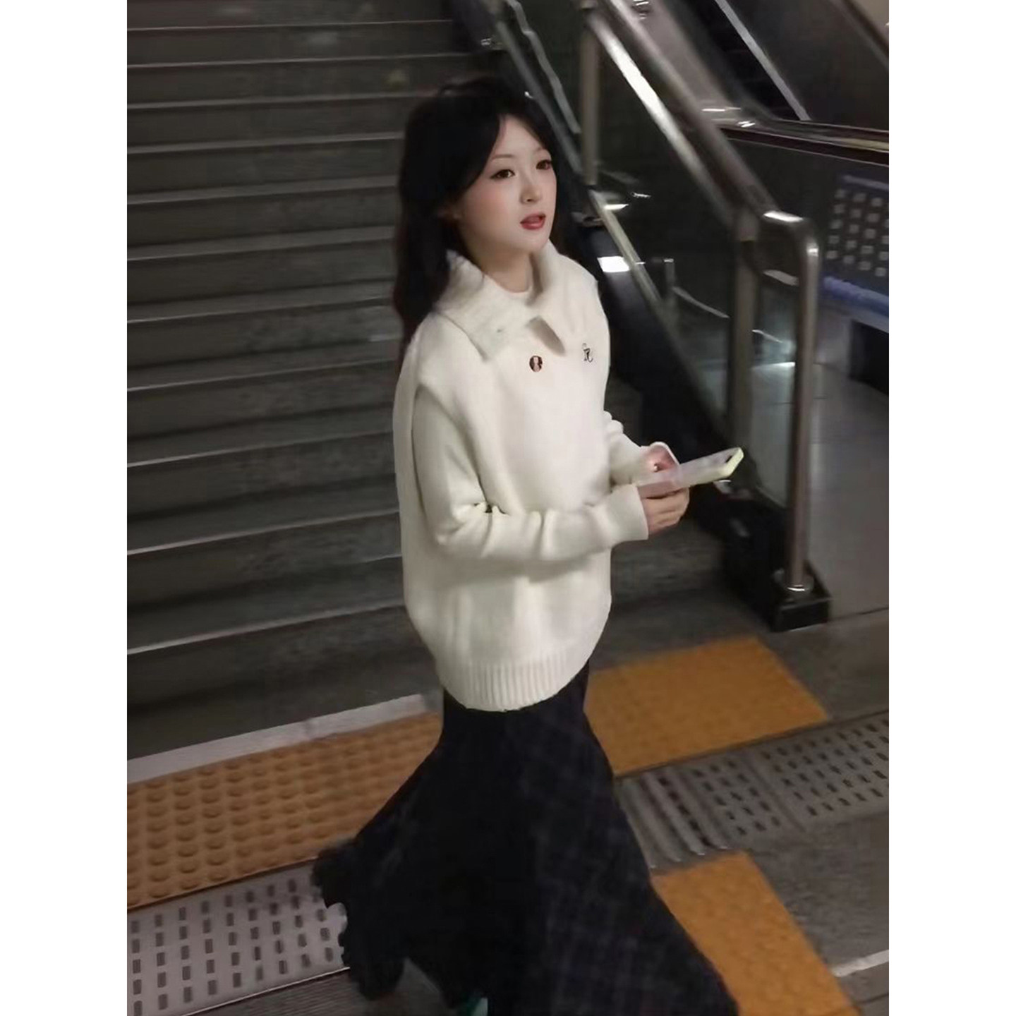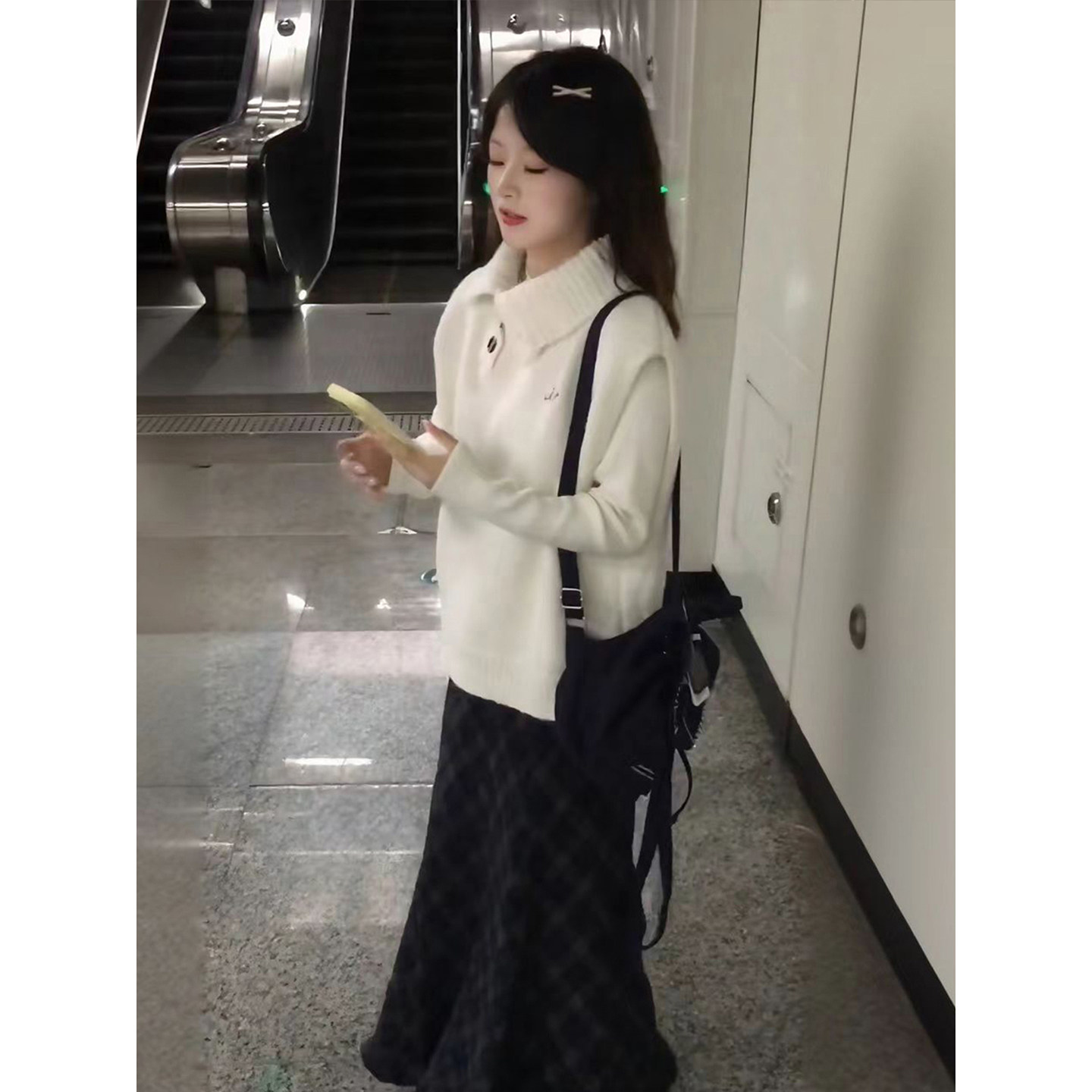 清纯甜妹穿搭高领白色长袖针织连衣裙秋冬新款加厚套头长裙子女装