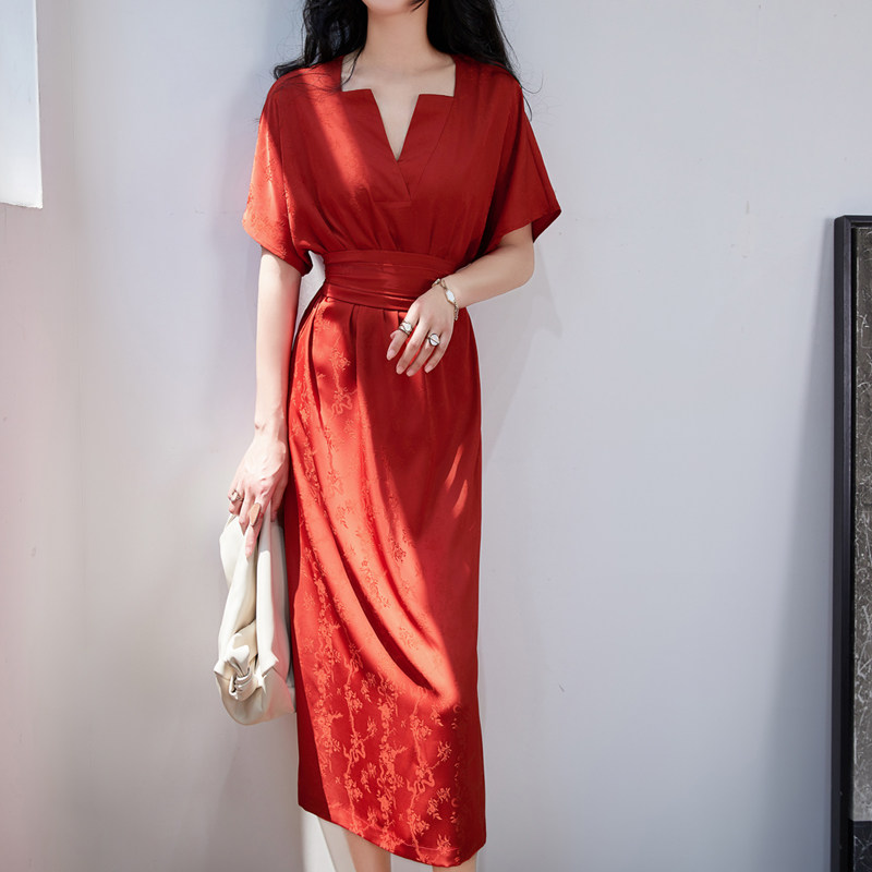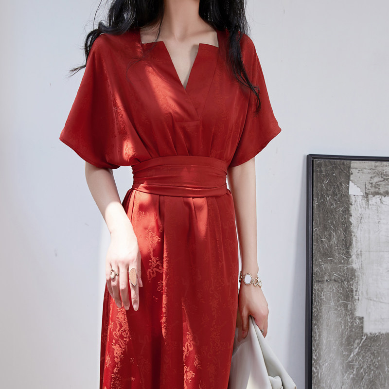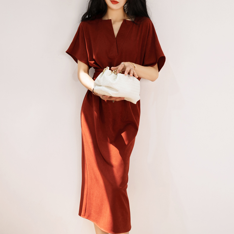 高级感法式复古V领红色连衣裙女夏 收腰显瘦赫本红裙气质连衣长裙